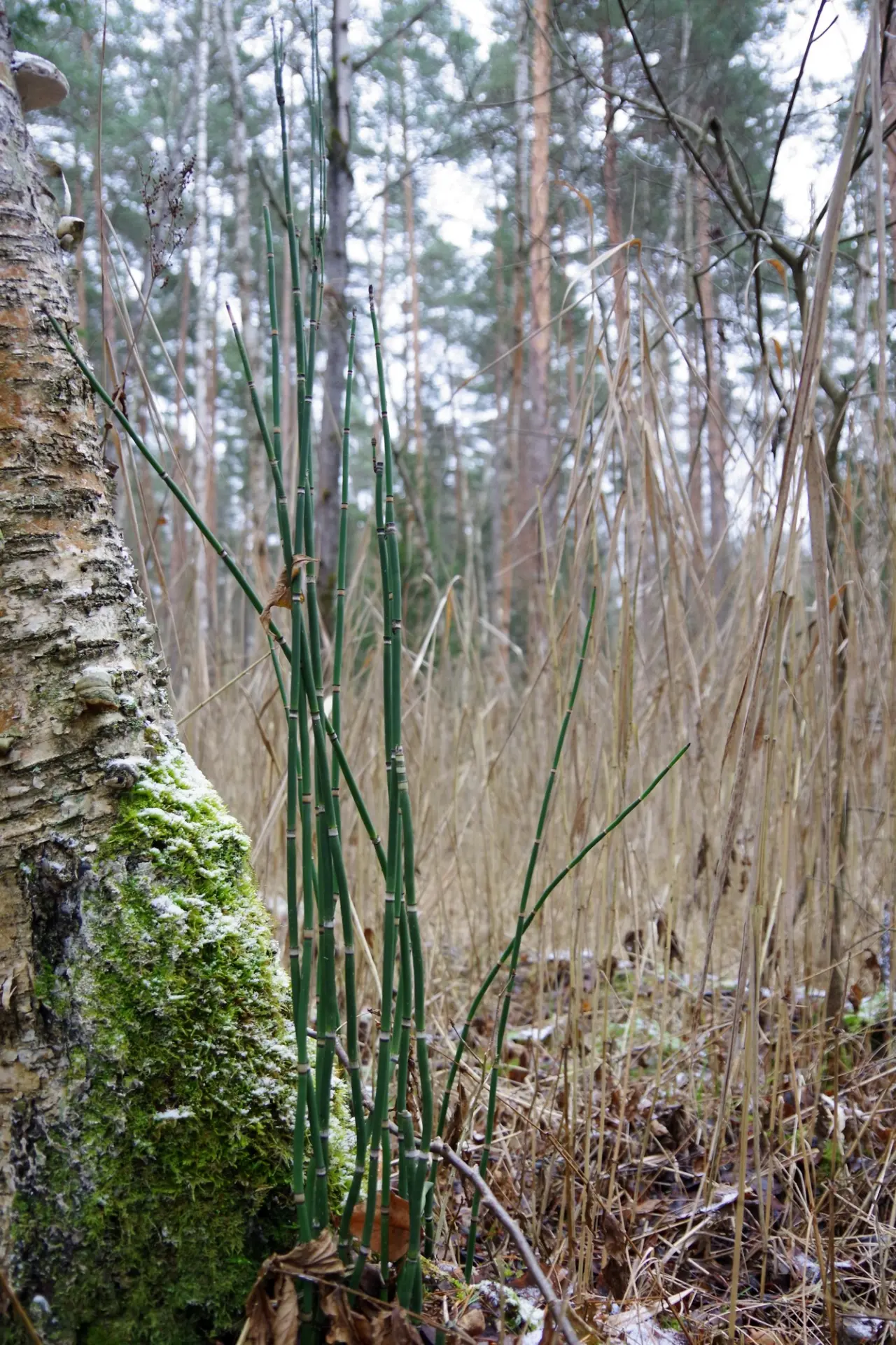 Летние соседи давно увяли, а жёсткие стебли хвоща зимующего (Equisetum hyemale) по-прежнему зелены.
