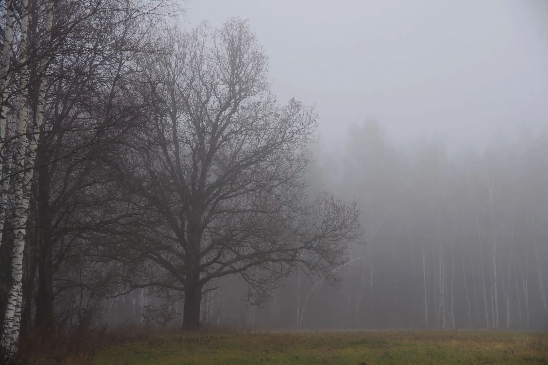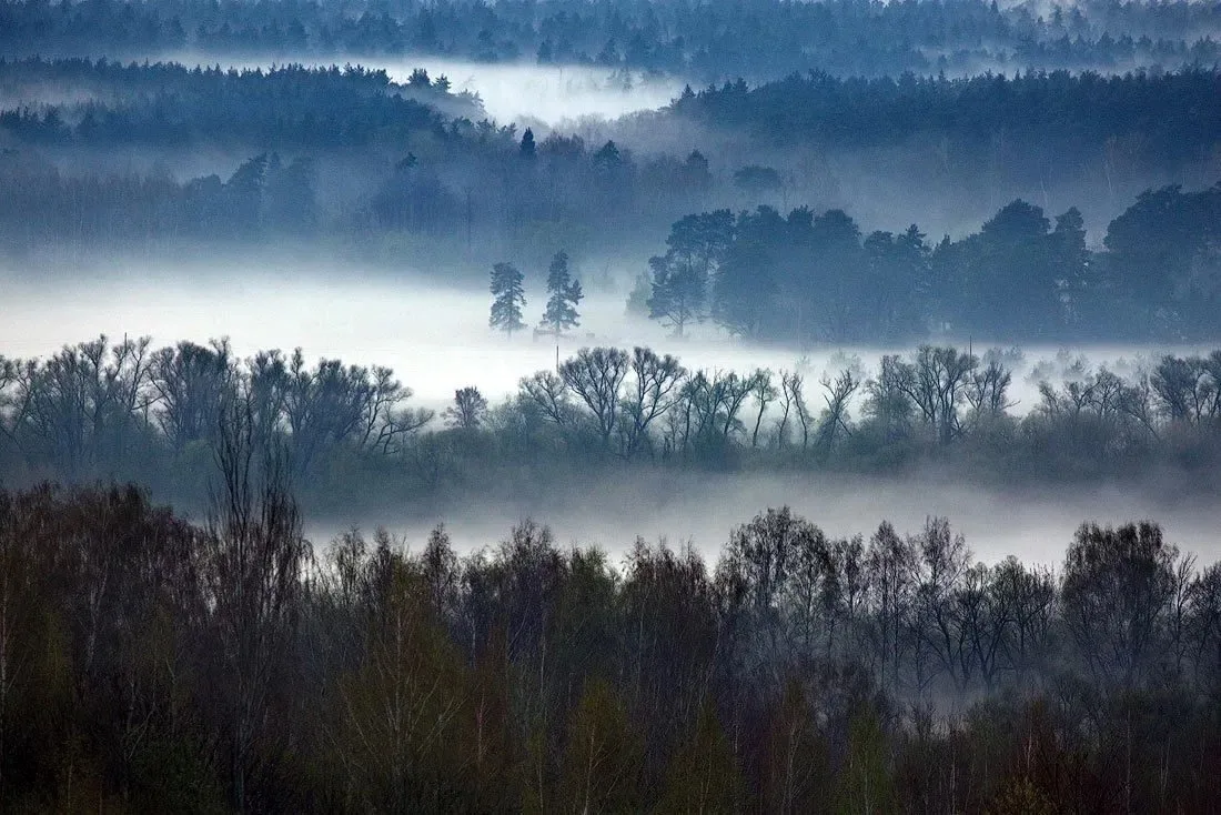 Нижняя полоса тумана — река Ока, средняя — пойма реки в охранной зоне заповедника, а верхний туман показывает место, где бежит маленькая речушка Пониковка.