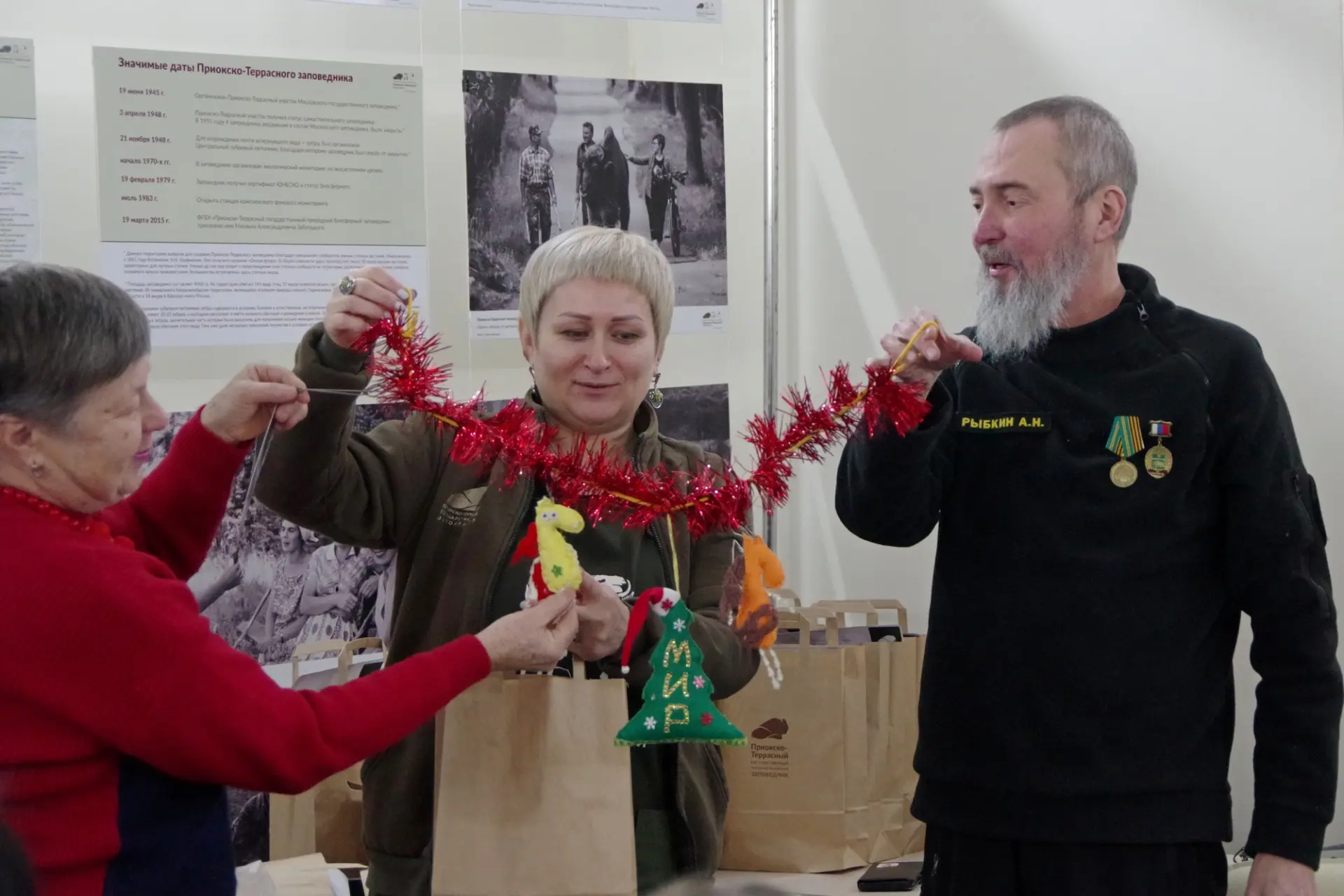 В период с 18 ноября по 11 декабря этого года на сайте заповедника проходил конкурс «Ёлочные игрушки для СВОих». Его участники создавали оригинальные праздничные украшения из экологических материалов. А в субботу 13 декабря они лично приехали к нам, чтобы привезти свои работы. Также на мероприятие прибыл почетный гость, друг, в недавнем прошлом сотрудник заповедника, начальник отдела экологического просвещения, а ныне руководитель волонтерского центра «Помощь для СВОих» Антон Рыбкин.