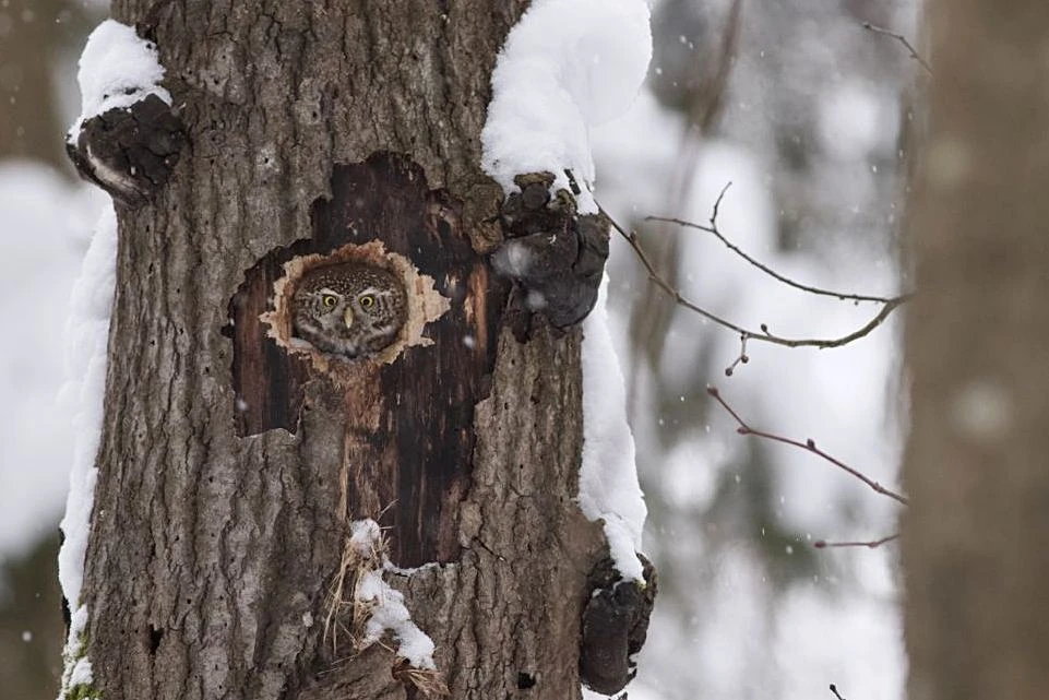 Этот сычик был сфотографирован неподалеку от Центрального зубрового питомника, который явно является его личными охотничьими угодьями. Перед тем как спрятаться в дупло, этот сычик удачно поохотился. Он уволок в свое укрытие мелкую птичку (точно разглядеть не удалось, возможно, королька или московку). А поскольку через несколько минут охотник выглянул наружу и покинул дупло с чистым клювом, значит, он был сыт и свою добычу оставил про запас.