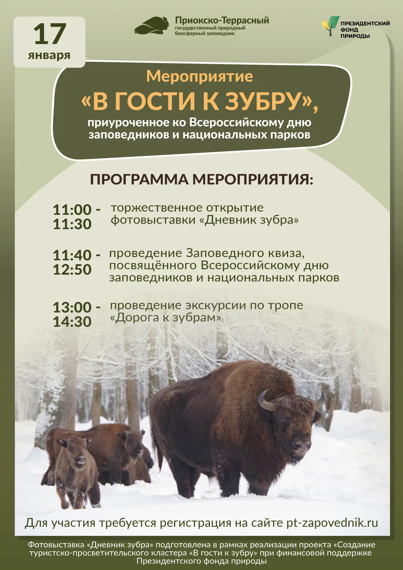 17 января 2026 года в Приокско-Террасном заповеднике состоится торжественное открытие уникальной фотовыставки под открытым небом «Дневник зубра», знакомящей с редким видом - зубром и программой по его восстановлению на ООПТ Центральной России. Выставка подготовлена при поддержке Президентского фонда природы в рамках проекта «Создание туристско-информационного кластера «В гости к зубру».