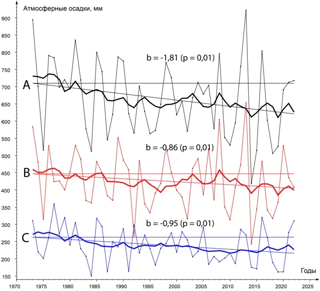 Наряду с ростом температуры отмечается постепенное иссушение климата. Годовое количество осадков снижается со скоростью 18,5 мм за 10 лет. Количество осадков холодного времени года снижается быстрее чем теплого, отчасти по причине постепенного сокращения длительности холодного периода.