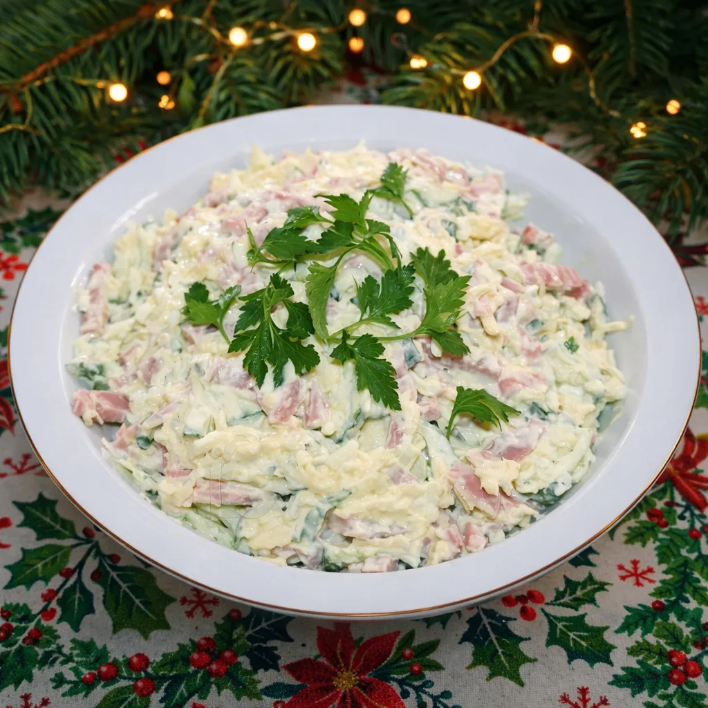 СОЧНАЯ КУРОЧКА, НЕЖНАЯ ВЕТЧИНА, ХРУСТЯЩИЕ МАРИНОВАННЫЕ ОГУРЧИКИ, СВЕЖИЕ ПОМИДОРЫ, ЯЙЦА И СЫР — ВКУС ЯРКИЙ, СВЕЖИЙ И ОЧЕНЬ ДОМАШНИЙ, СМЕТАННАЯ ЗАПРАВКА ВСЁ СОБИРАЕТ В ИДЕАЛЬНЫЙ БАЛАНС, ГОТОВИТСЯ БЫСТРО, СЪЕДАЕТСЯ МГНОВЕННО