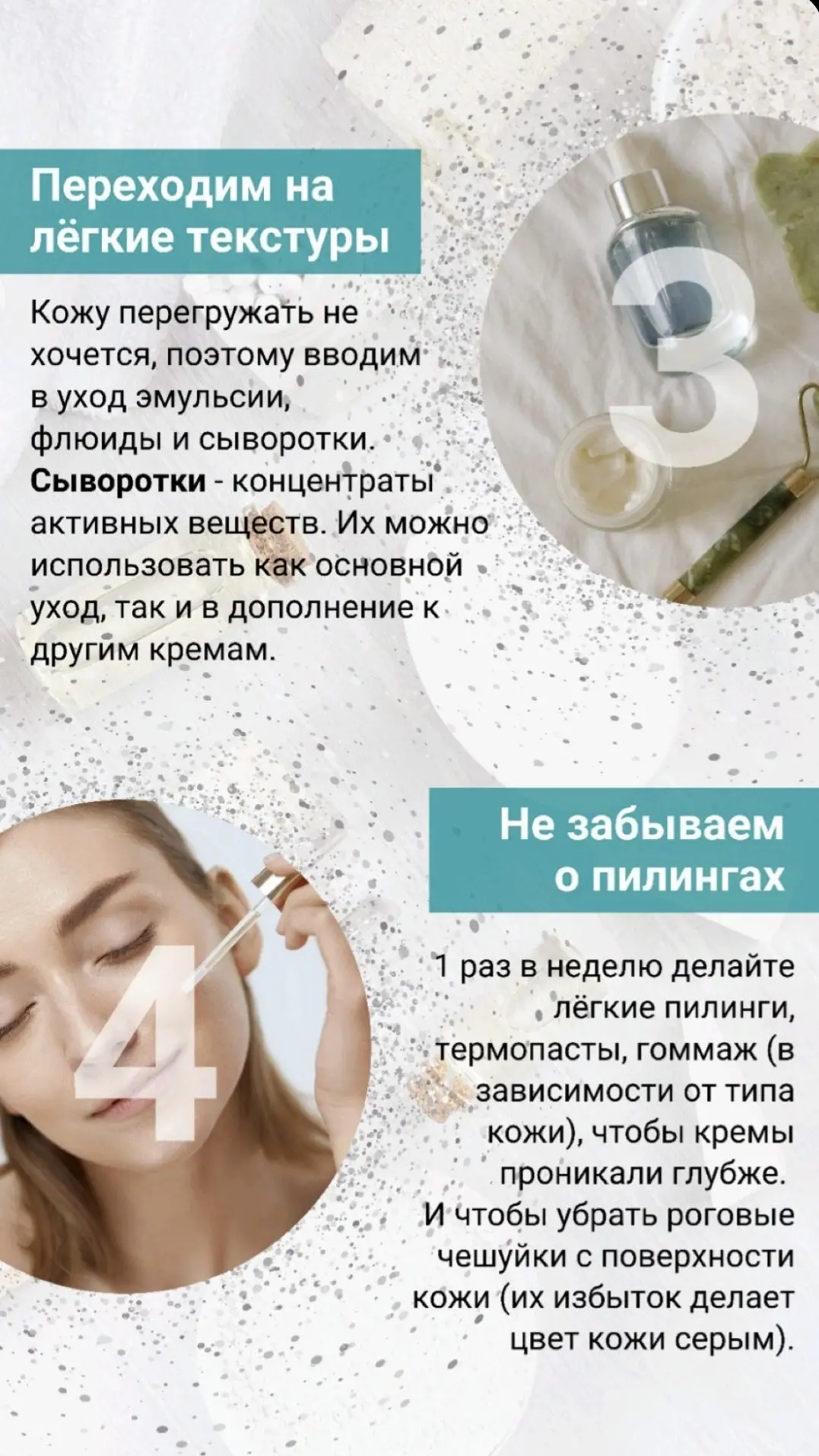 Сейчас коже нужна не агрессия, а мягкое восстановление: лёгкое увлажнение каждый день, деликатное отшелушивание 1 раз в неделю и обязательный SPF.