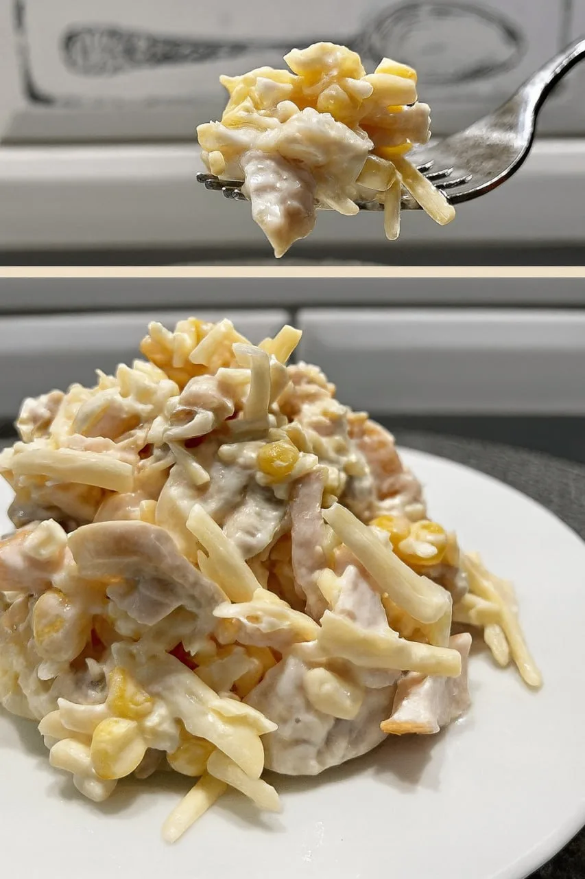 Все ингредиенты соедините в салатнике, добавьте кукурузу, посолите и поперчите. Заправьте майонезом и тщательно перемешайте. Салат готов — он действительно оправдывает своё название и станет «мечтой» для любого застолья. ✨