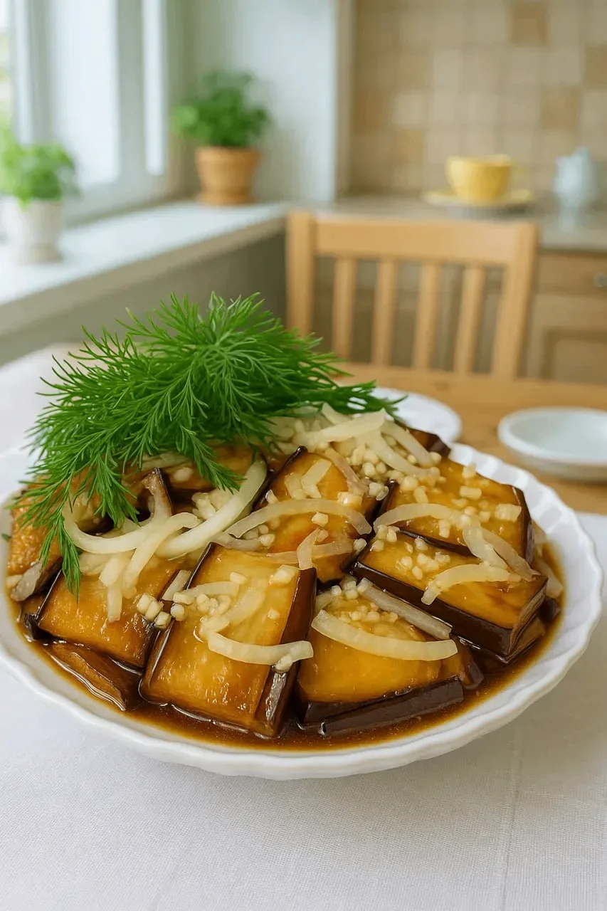 После настаивания баклажаны пропитаются ароматами маринада, лука и чеснока, и получится нежный, пикантный салат.