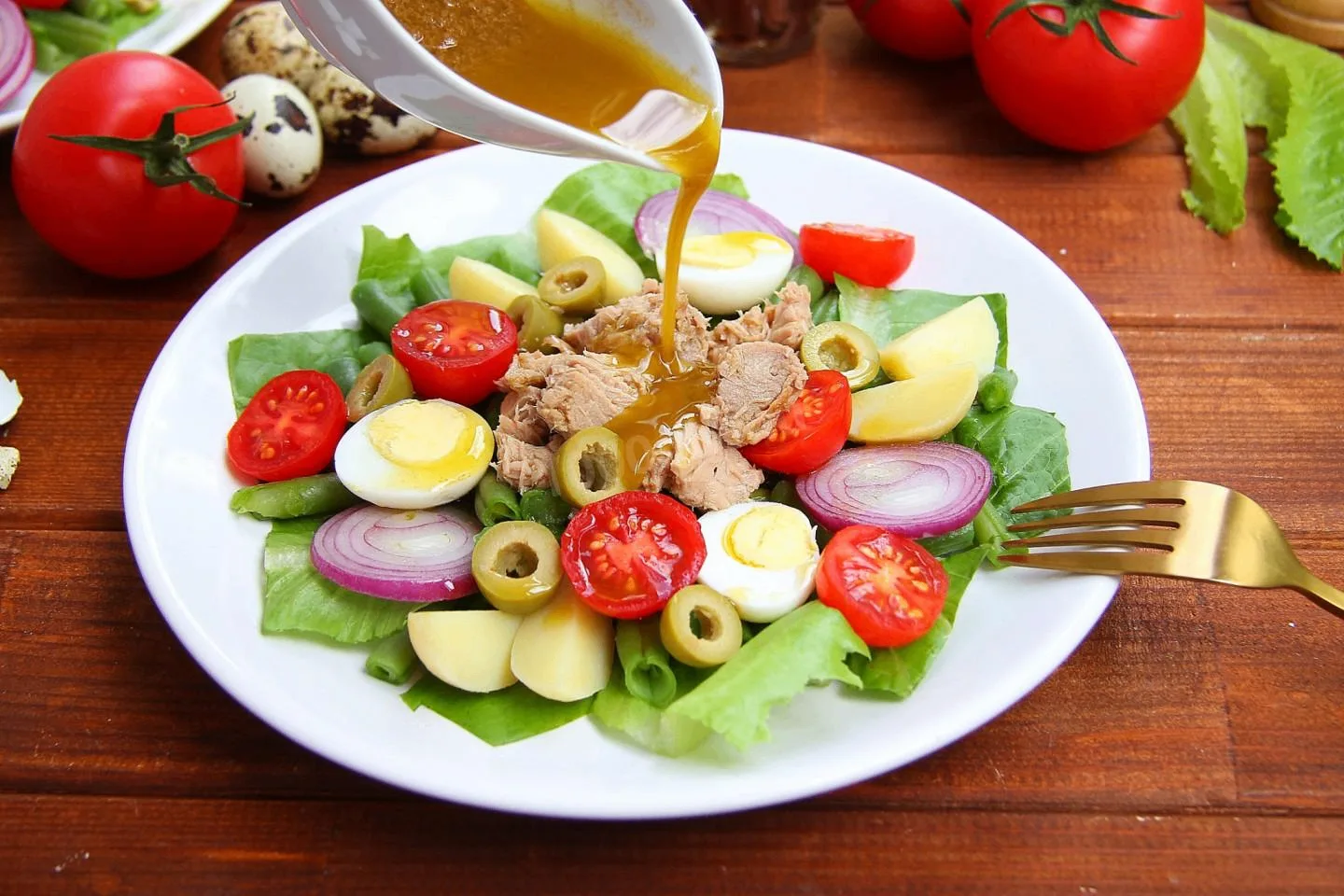 Отварите молодой картофель в кожуре до готовности, затем остудите и нарежьте крупными кусочками. Бланшируйте зелёную фасоль в кипятке 5–10 минут до мягкости, после чего обдайте холодной водой. Яйца сварите вкрутую, остудите и разрежьте на половинки или четвертинки. Помидоры черри разрежьте пополам, листья салата промойте и обсушите. В широкое блюдо выложите основу из салатных листьев, сверху разложите картофель и фасоль, добавьте тунца, помидоры, оливки и яйца. Если используете анчоусы, разместите их аккуратно между остальными компонентами. Для заправки смешайте оливковое масло с дижонской горчицей и уксусом, посолите и поперчите по вкусу, полейте салат перед подачей. Нисуаз можно подавать сразу или слегка охладить.