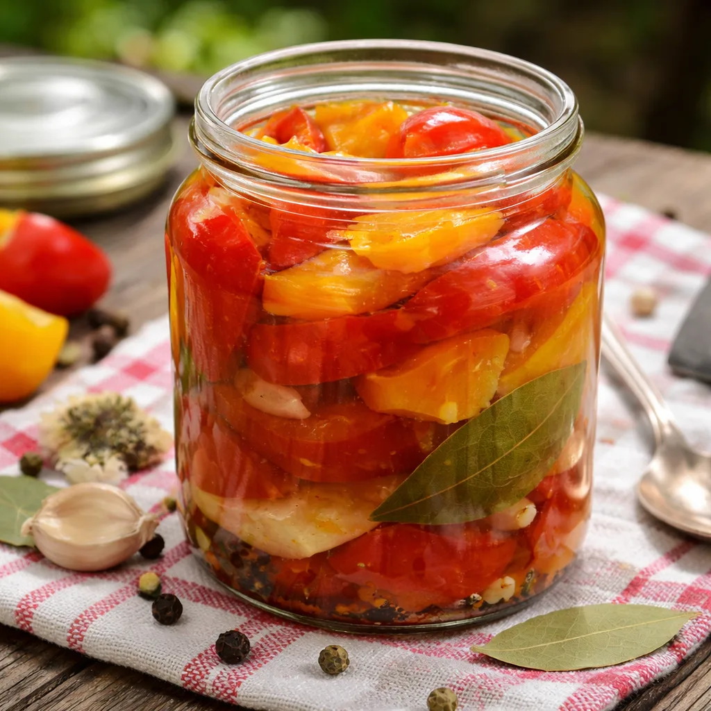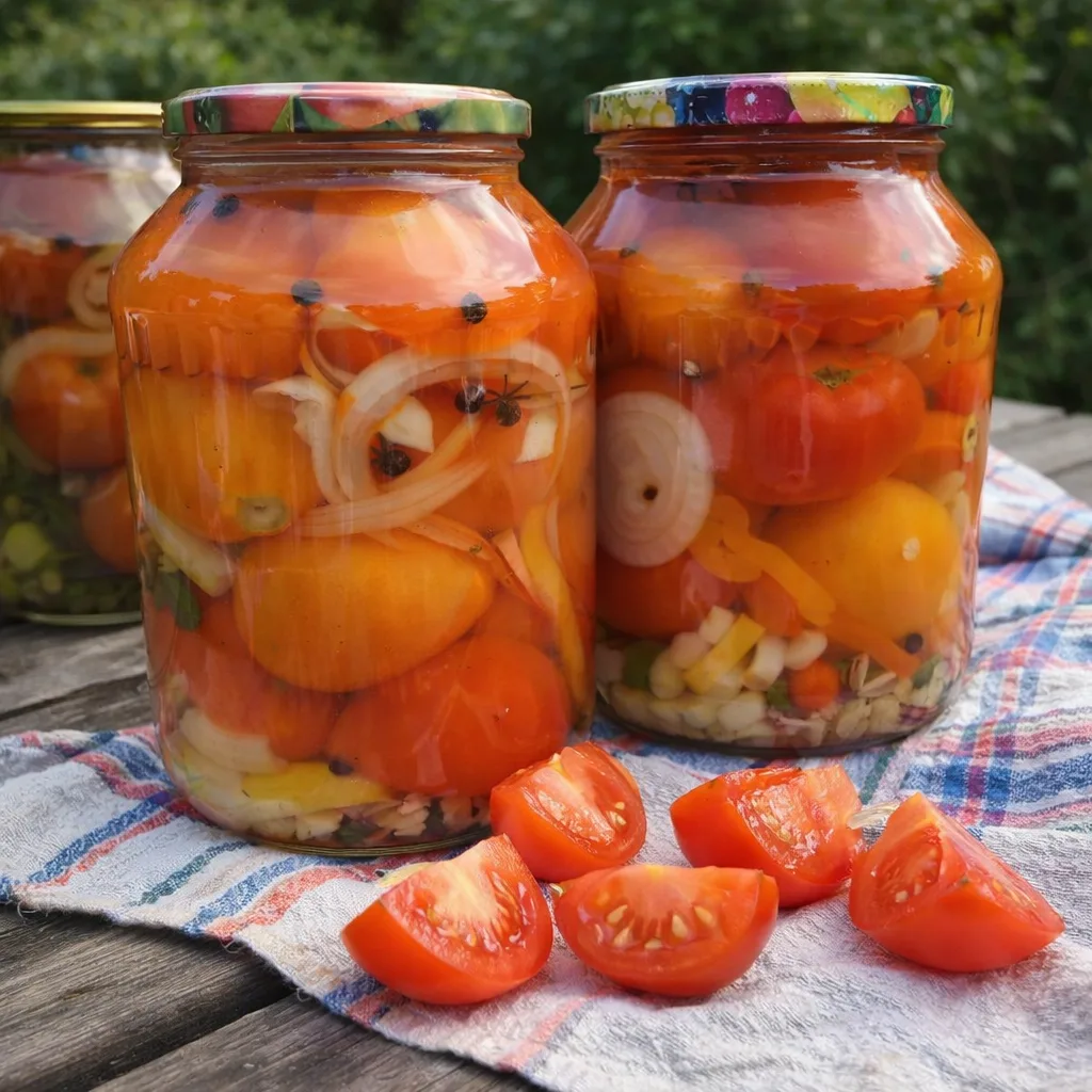 Такая заготовка сочетает сладость, лёгкую кислоту и насыщенный аромат специй. Помидоры остаются плотными, а маринад получается настолько вкусным, что редко доживает до весны.
