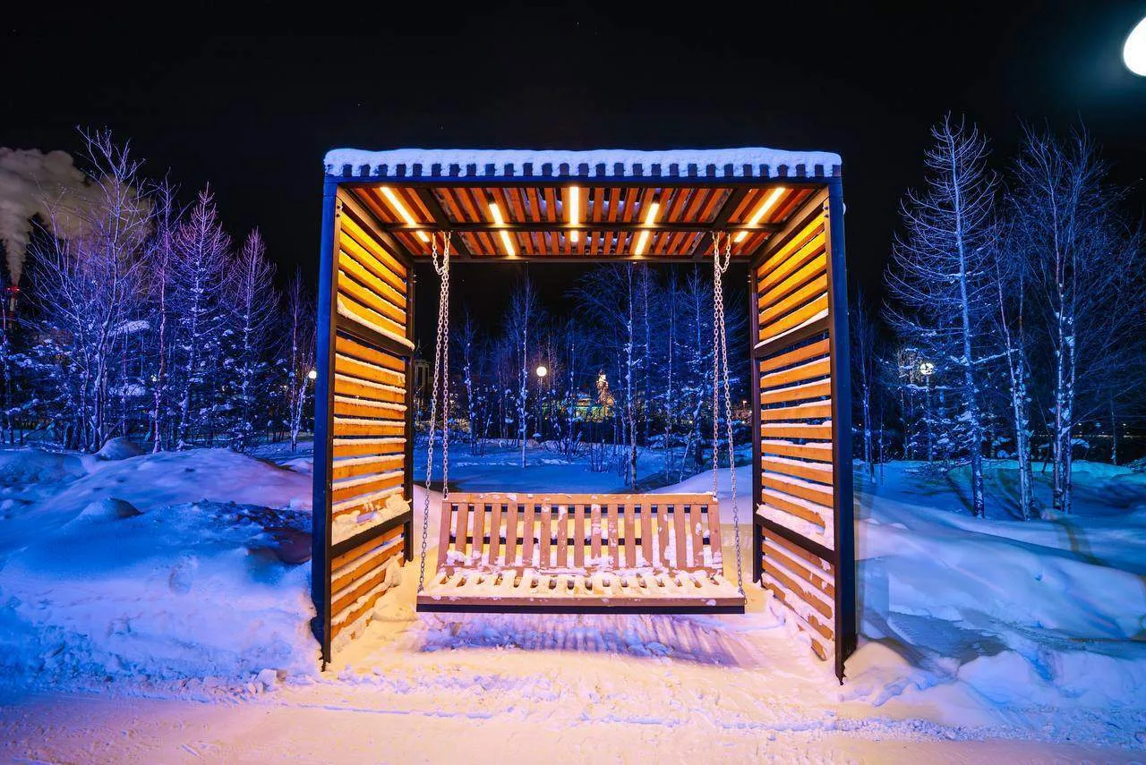 Новая архитектурная подсветка у скульптуры преобразила пространство. Летом здесь можно будет ещё и на качелях покачаться.