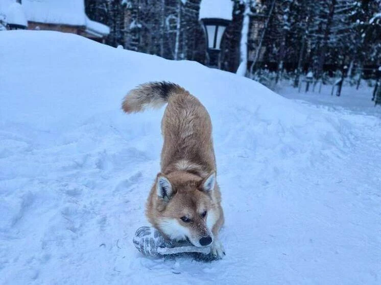 Мужчина поделился фотографиями питомца, отметив, что пёс, родившийся на Ямале, не боится морозов и даже при –37°C с удовольствием играет на улице.