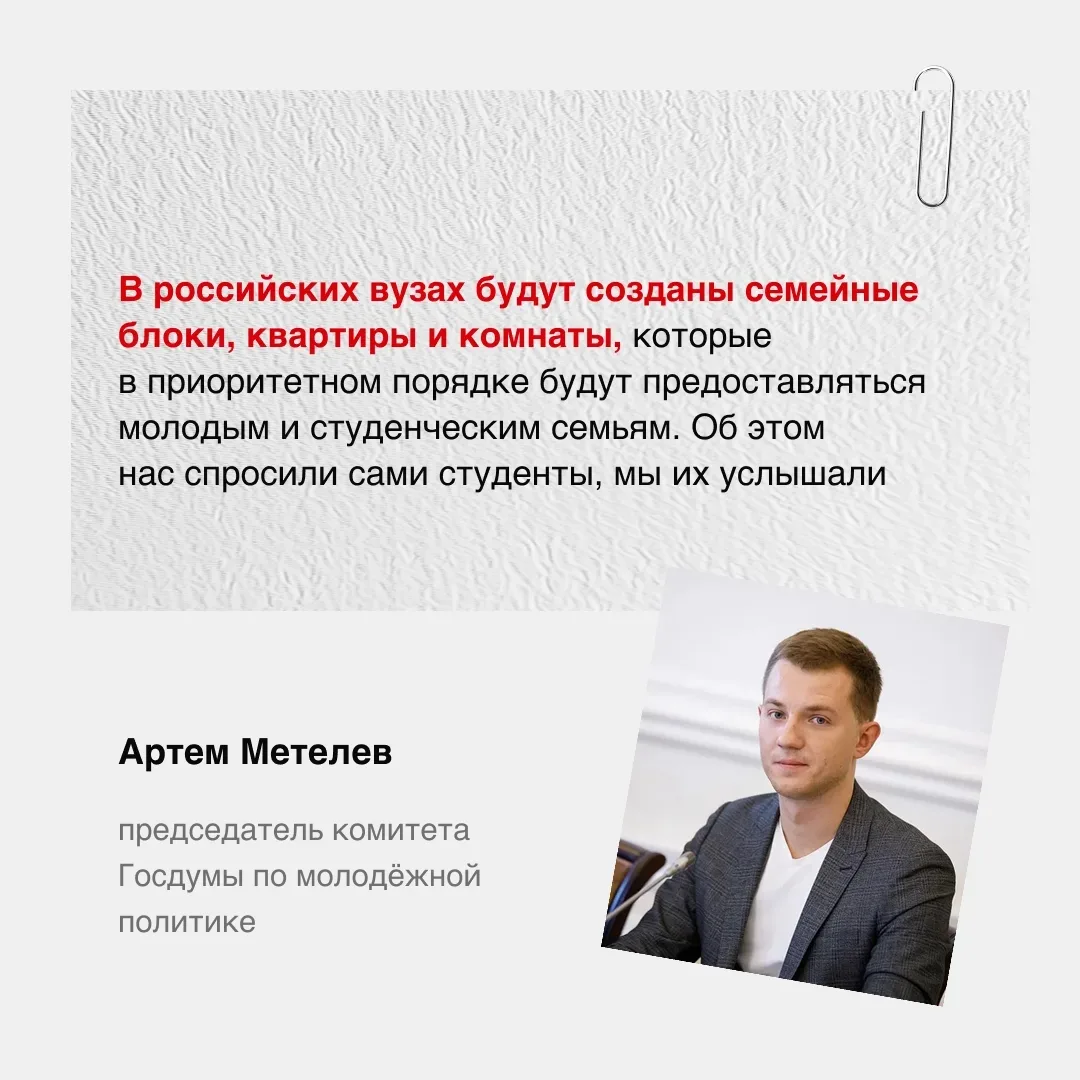 «Единая Россия» услышала запрос студентов. Теперь учебные заведения будут обязаны предоставлять отдельные комнаты, семейные блоки и квартиры из существующего жилого фонда молодым семьям в первую очередь.