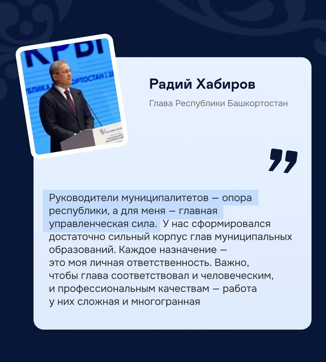 Глава Республики Башкортостан Радий Хабиров на своих страницах пишет: «Важно, что на протяжении последних лет мы сохраняем неплохую динамику. В прошлом году мы впервые вошли в десятку регионов с высоким качеством жизни, хотя по по итогам 2021-го были только 40-ми».
