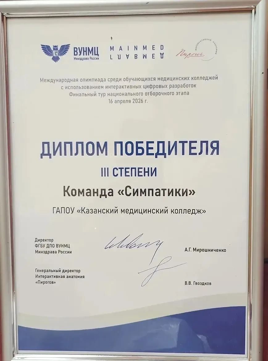 Команда «Симпатики» Казанского медицинского колледжа заняла почётное III место на втором этапе Международной олимпиады среди обучающихся медицинских колледжей. Мероприятие прошло в городе Москва с применением интерактивных цифровых разработок.