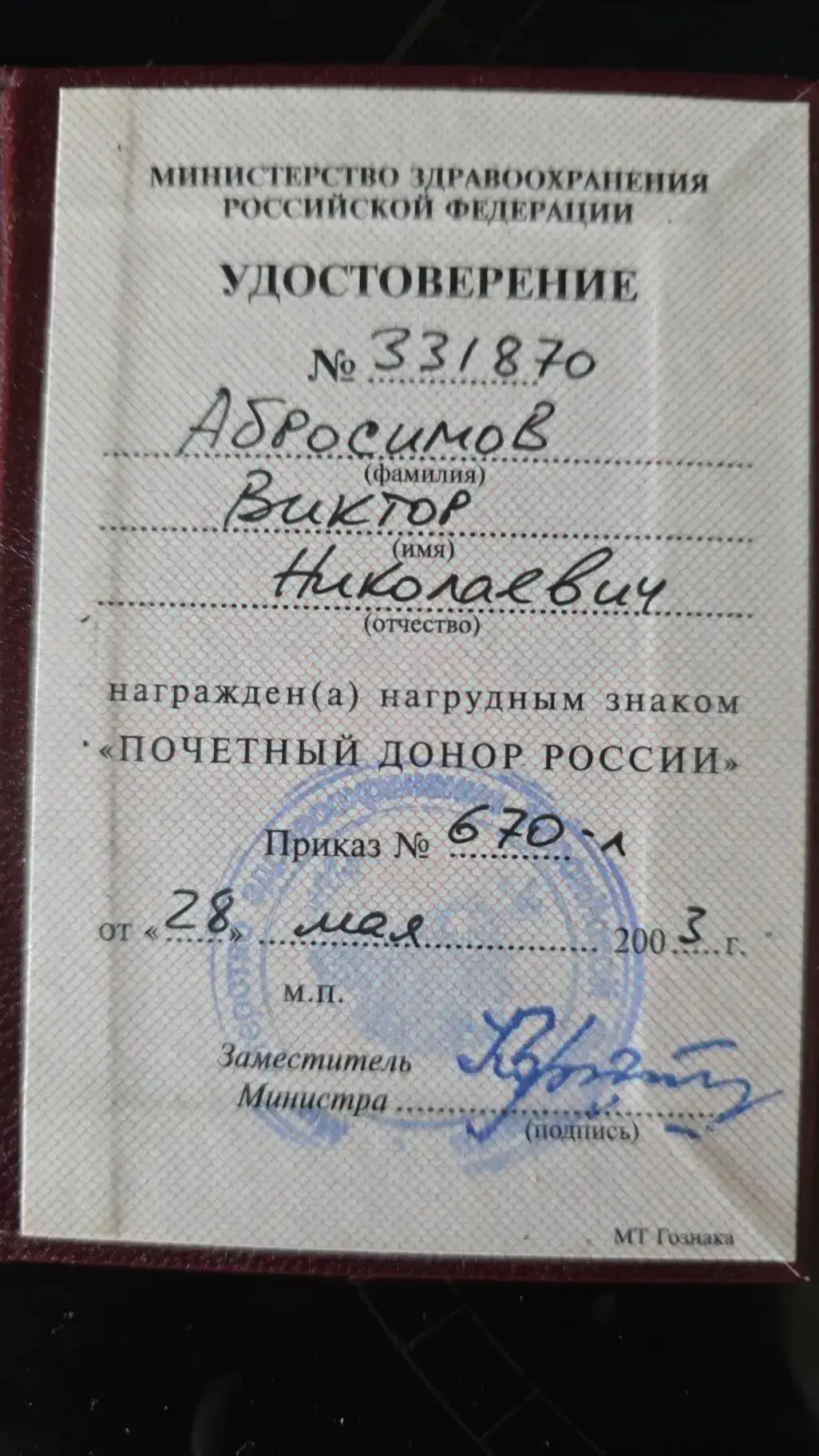 Виктор Николаевич — опытный врач-реаниматолог и почётный донор России. Свое удостоверение он получил ещё в 2003 году, что говорит о многолетней и регулярной помощи людям. Его пример вдохновляет молодых коллег и доказывает: спасать жизни можно не только аппаратом ИВЛ и дефибриллятором, но и собственной кровью.