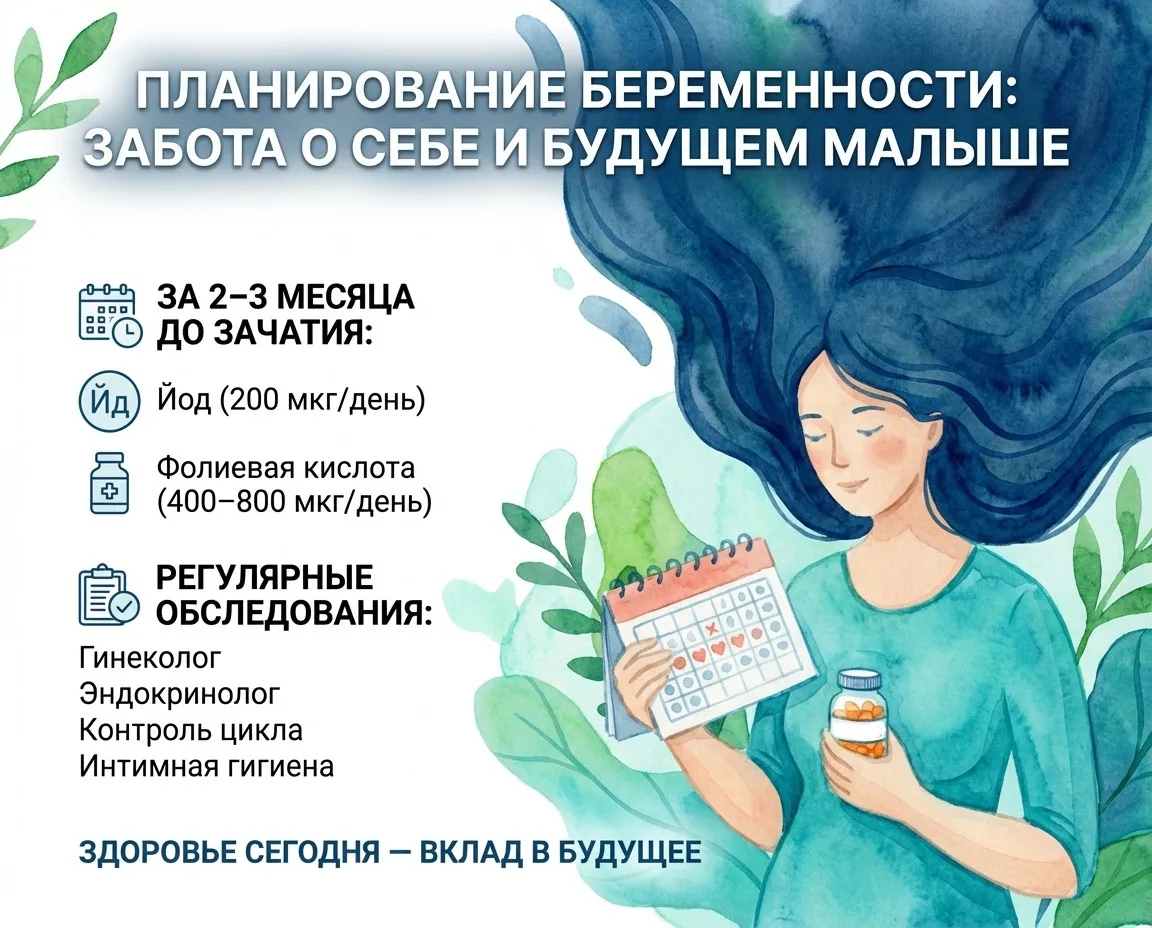 Особое внимание — планированию беременности. Женщинам рекомендуется за 2–3 месяца до зачатия начать приём препаратов йода (200 мкг в день) и фолиевой кислоты (400–800 мкг в день) для профилактики дефектов развития плода. Эти рекомендации закреплены в клинических рекомендациях Минздрава России. Также важно регулярно проходить обследования у гинеколога и эндокринолога, следить за менструальным циклом и соблюдать интимную гигиену. Физическая активность во время беременности полезна, но должна быть согласована с врачом. Забота о себе сегодня — вклад в здоровье будущих детей.