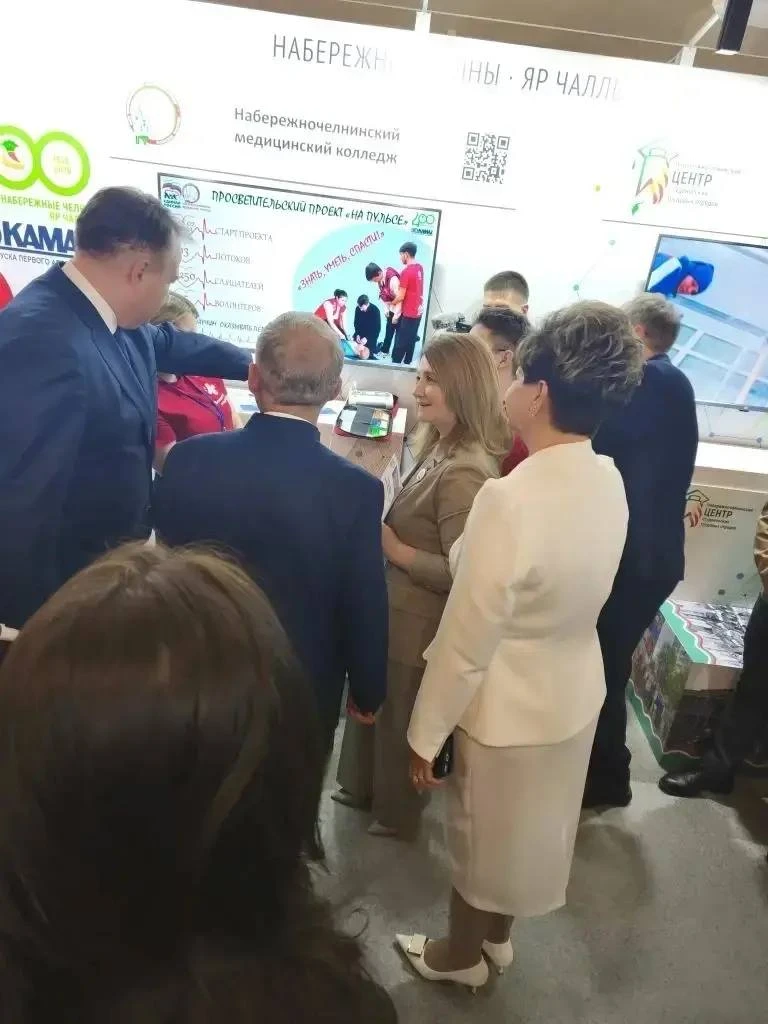 Руководитель Набережночелнинского медколледжа Нургатина Ирина Ефимовна вместе с волонтерами Хакимовой Камиллой и Хабибуллиным Тагиром представили просветительский проект "НаПульсе" на выставке итоговой сессии горсовета Набережных Челнов, приуроченной к знаменательной дате — 50-летию со дня выпуска первого автомобиля КАМАЗ