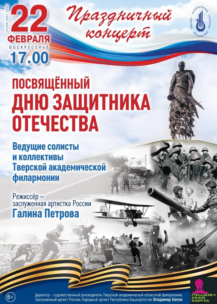 ✅ Праздничный концерт 22 февраля пройдет в Тверской академической областной филармонии: выступления ведущих солистов и коллективов в программе из патриотических номеров.