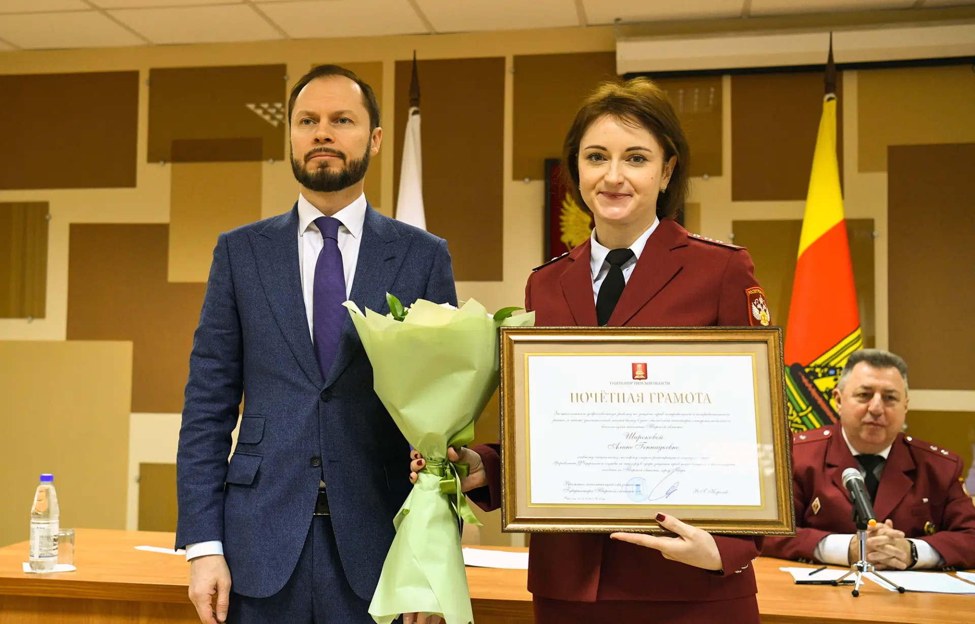 Участниками церемонии стали представители добровольческого движения помощи фронту. Почетными грамотами Губернатора Тверской области отмечены организатор координационного движения «Помощь СВОим» из Калининского округа Виктор Лугин, руководитель инициативной группы «КуVшиновский тыл» Александр Владимиров.