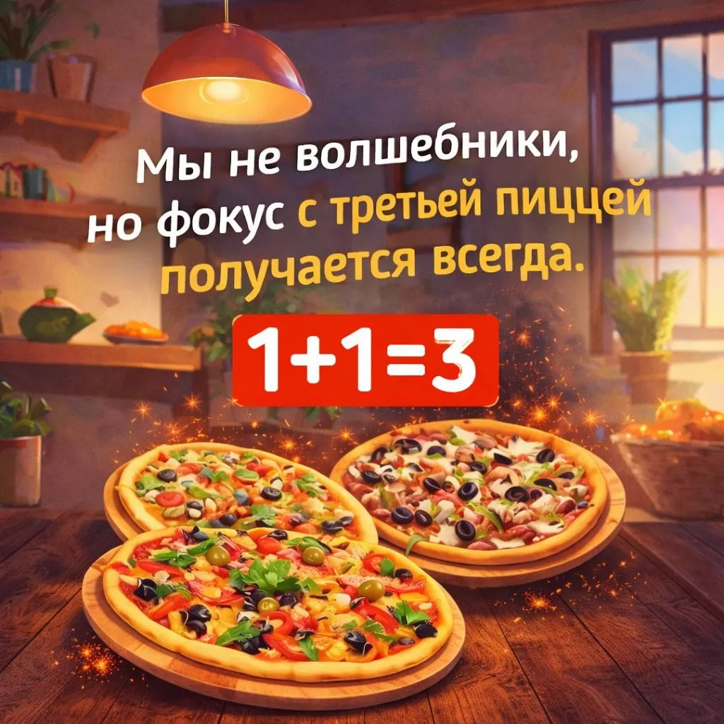 Дорогие друзья, у нас для вас математика со вкусом! Закажите две пиццы, а третью получите в подарок. Всё просто и очень вкусно!