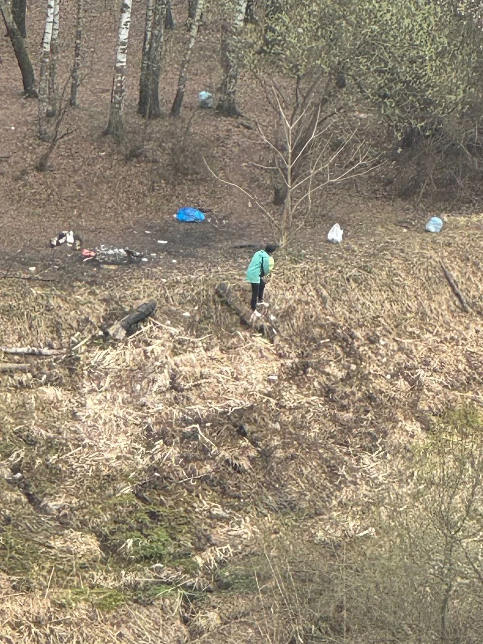 Женщина взяла с собой мусорные пакеты и убирает мусор в этом злачном месте. И видно, по ней, что она не ожидала, что его будет так много! А это только вторая неделя тепла. Впереди все лето…