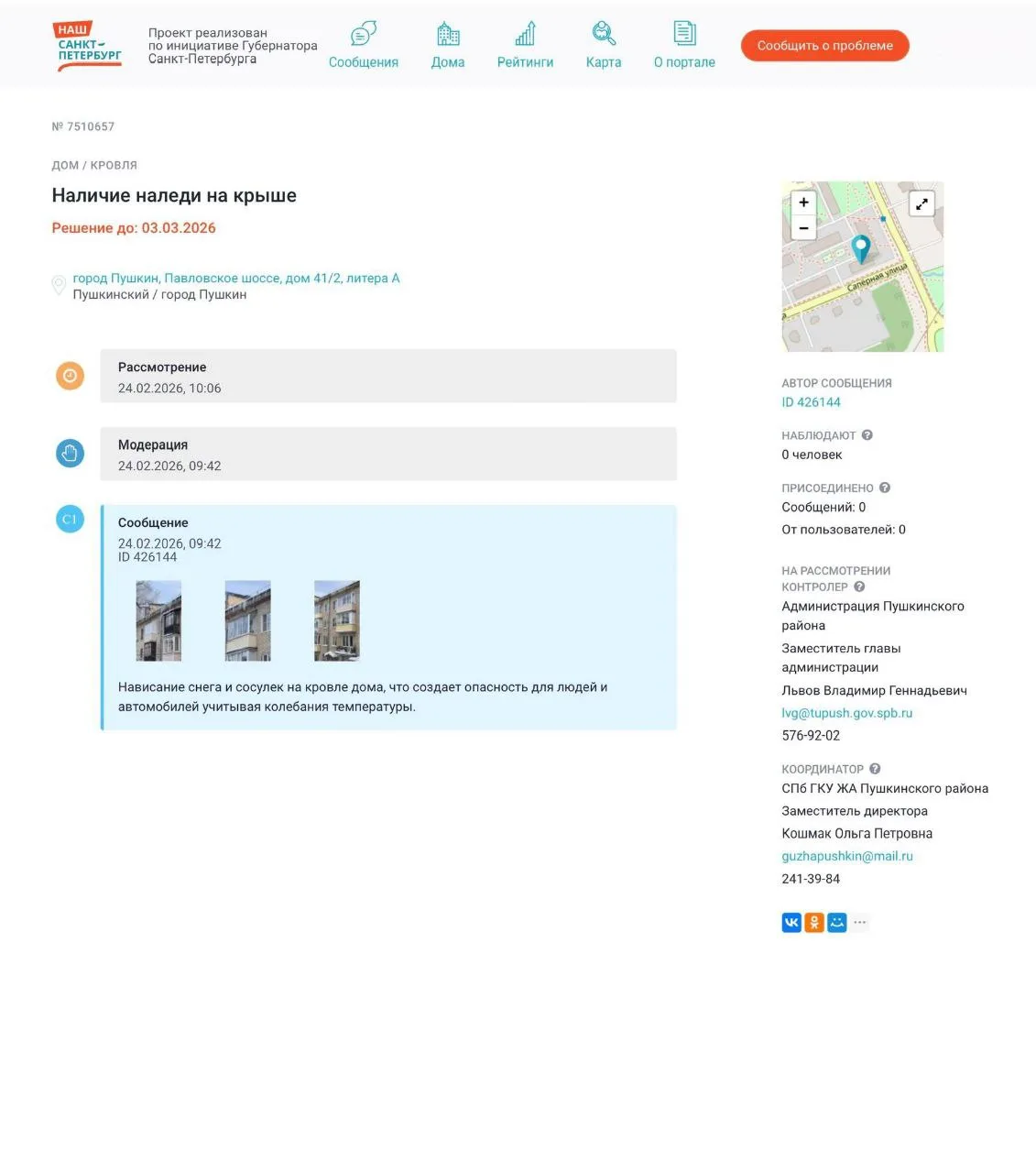 Неравнодушные жители дома на Павловском шоссе писали заявку на наличие наледи и сосулек, но заявка так и осталась висеть с 24.02 не рассмотренной. По итогу с 28 февраля по 1 марта зафиксировано 3 случая падения льда с крыши, 2 из них с ущербом.