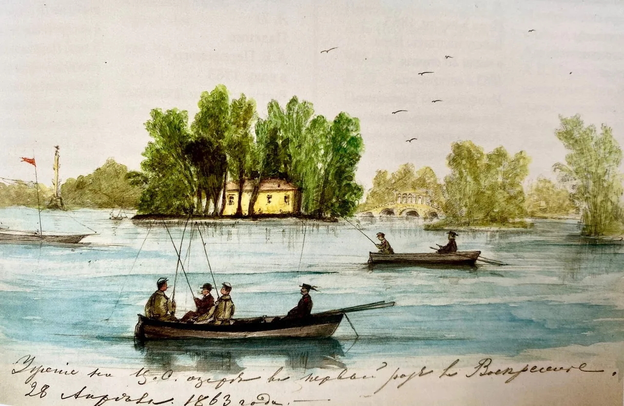Изображены цесаревич Николай Александрович, А.Б. Перовский, великий князь Александр Александрович, Степанов, великий князь Владимир Александрович.