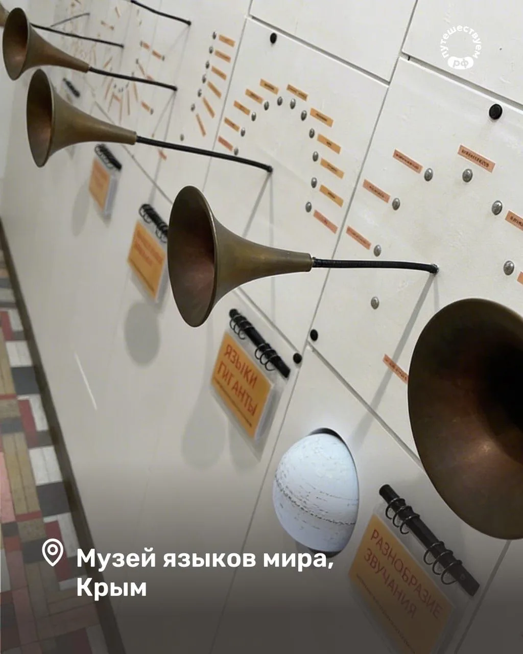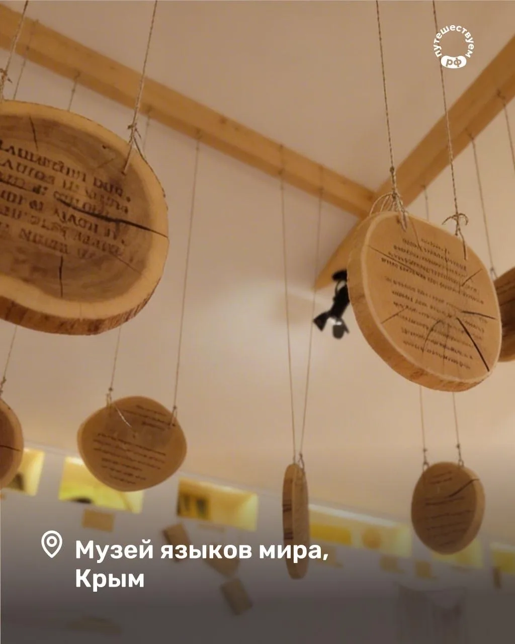 🌎 Музей языков мира, Крым. На планете около 7000 языков — и здесь можно увидеть и услышать многие из них. Вы узнаете, на чем и как писали в разные эпохи: от камня и бересты до пальмовых листьев. А еще погрузитесь в узелковое письмо инков, историю Розеттского камня и загадку рукописи Войнича. Почти все экспонаты можно трогать: покрутите устройство XVI века, чтобы читать восемь книг одновременно, и послушаете музефон.
