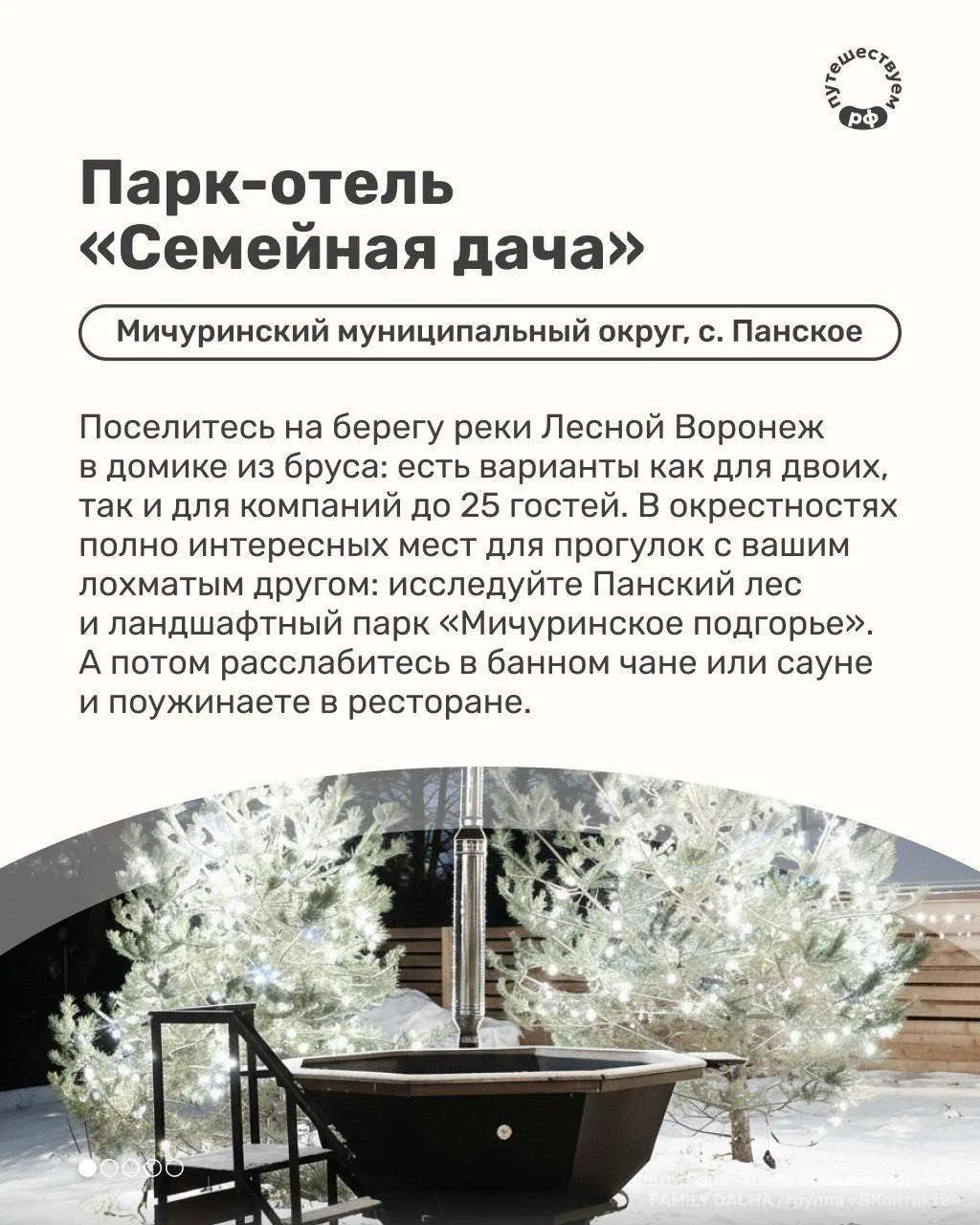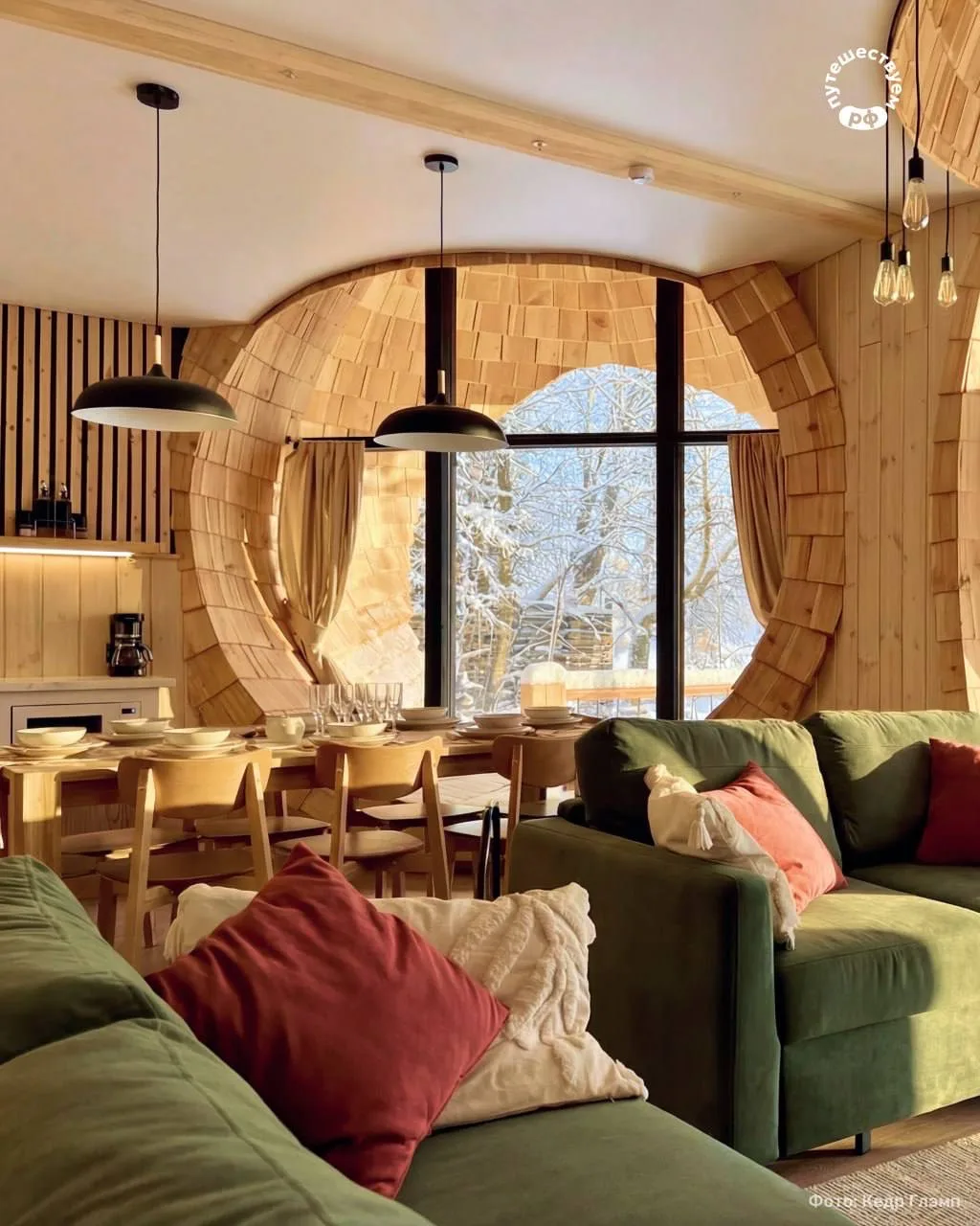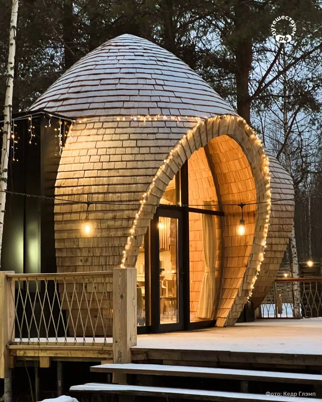 🟡 «Кедр Глэмп». Здесь очень атмосферно: домики в форме кедровых шишек, и лес — близко-близко. После прогулок на свежем воздухе приятно согреться в бане или горячей купели под открытым небом. Ощутите северное спокойствие и волшебно проведете время с родными.