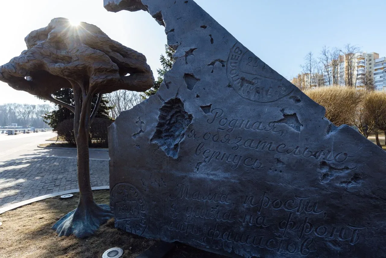 После встречи вместе заехали в Парк Победы. Там установлен памятный знак в виде фронтового письма, через пулевое отверстие в котором прорастает дерево. Монумент создан по инициативе фонда Алексея Талая из монет, которые передавали люди в память о подвиге поколения победителей.