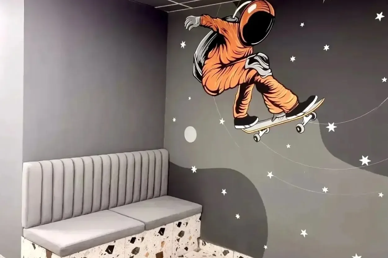 Для детей оборудовали игровую зону: можно посмотреть мультфильмы, поиграть или порисовать. Пространство оформили в разных темах – морские обитатели, животные, космос.