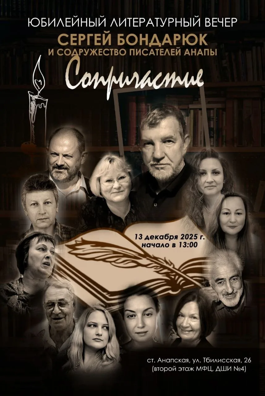 Творческий вечер Сергея Бондарюка и содружества писателей Анапы состоится 13 декабря в 13:00 в Детской школе искусств № 4 по адресу: станица Анапская, ул. Тбилисская, 26 (второй этаж здания МФЦ).