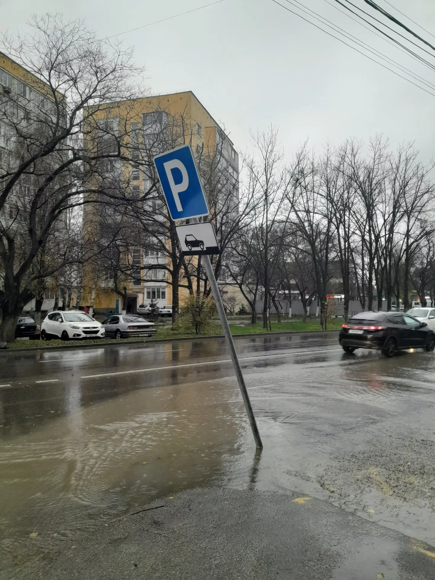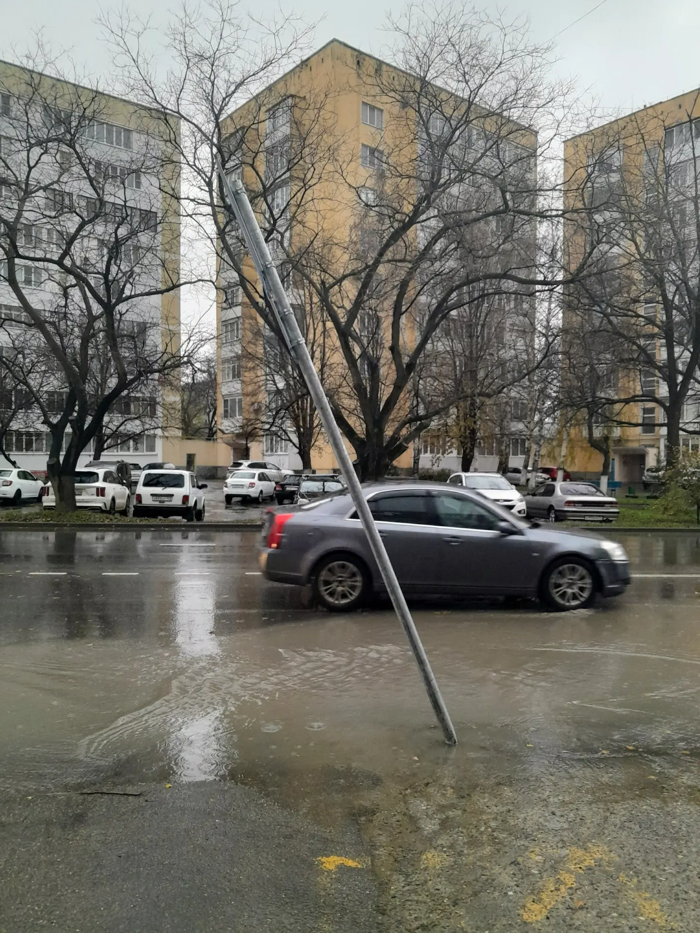 Новый дорожный знак на Объездной не выдержал напора бурного потока воды, который образовался после декабрьского залпового ливня, и накренился.