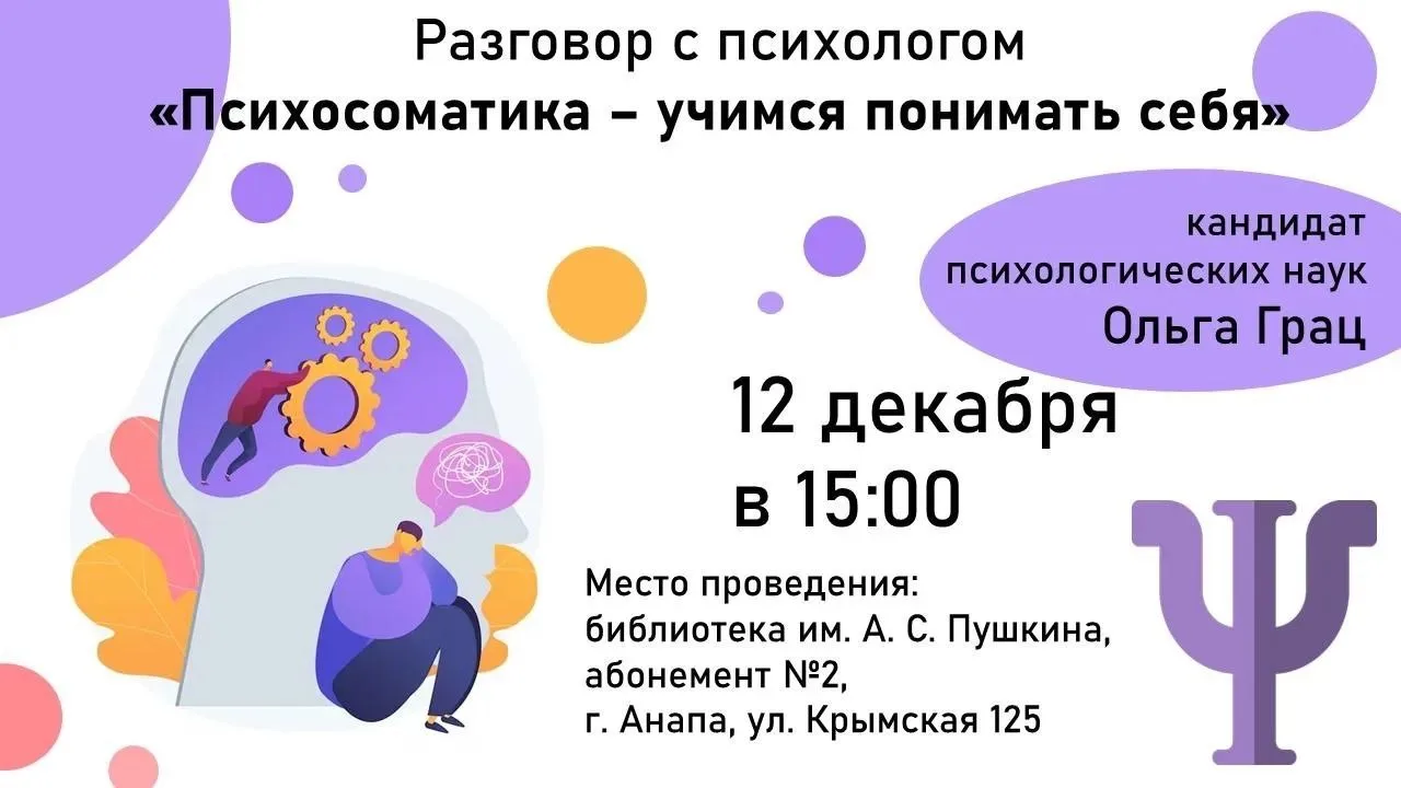 Анапчан приглашают на встречу с психологом, посвященную теме взаимосвязи между нашими эмоциями и физическим состоянием.