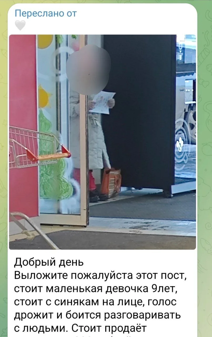 Добрый день. Выложите пожалуйста этот пост, стоит маленькая девочка 9лет, стоит с синякам на лице, голос дрожит и боится разговаривать с людьми. Стоит продаёт рисунки за 200 рублей, рисунки нарисованные не ребенком, а взрослым человеком и это видно по рисункам. Люди помогите ребенку подзаработать денег, видно, что ребенка заставляют продавать эти рисунки. Ребенка видно бьют и очень сильно..