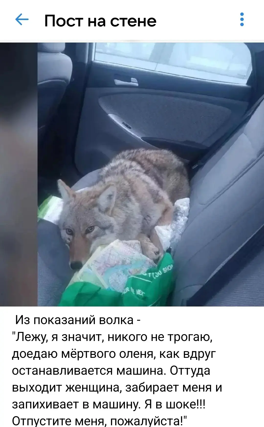 На заднем сиденьи лежит .... ВОЛК. Настоящий. Серый. Матёрый.