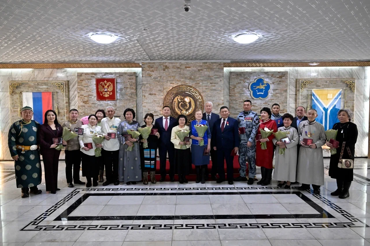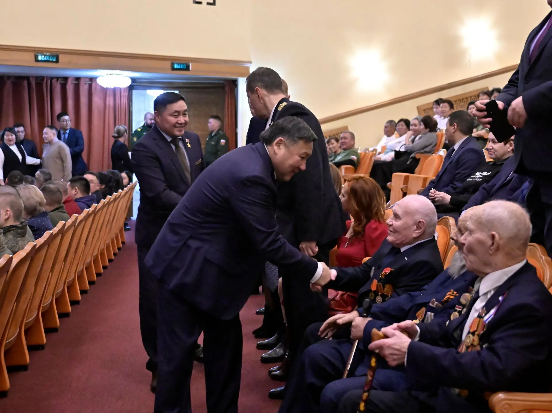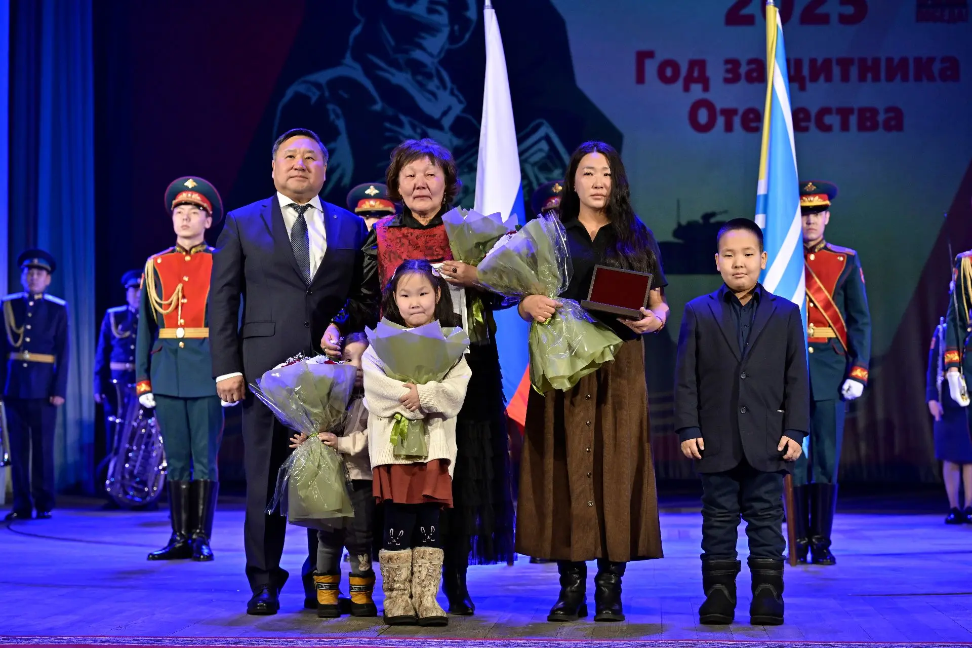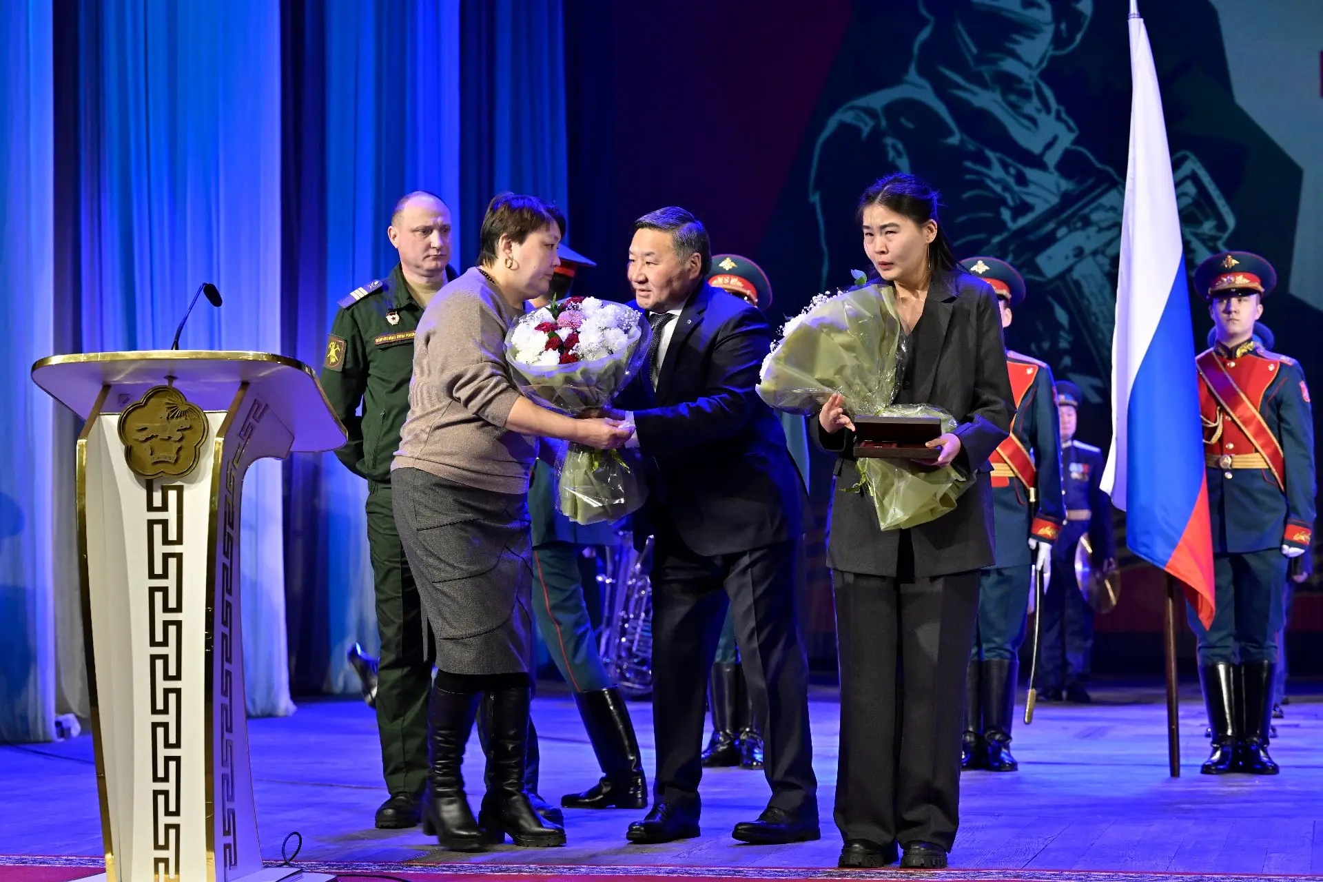 На торжественном собрании были вручены государственные награды родным военнослужащих из Тувы, героически погибших в ходе выполнения боевых задач в зоне СВО. Зрительный зал стоя аплодировал жёнам и матерям героев, которые выходили на сцену за наградами.