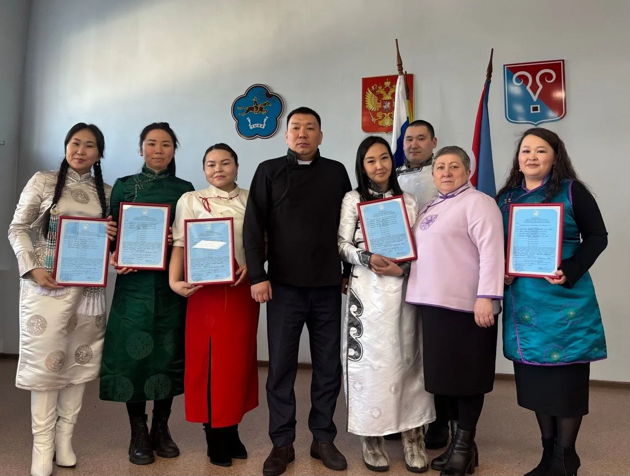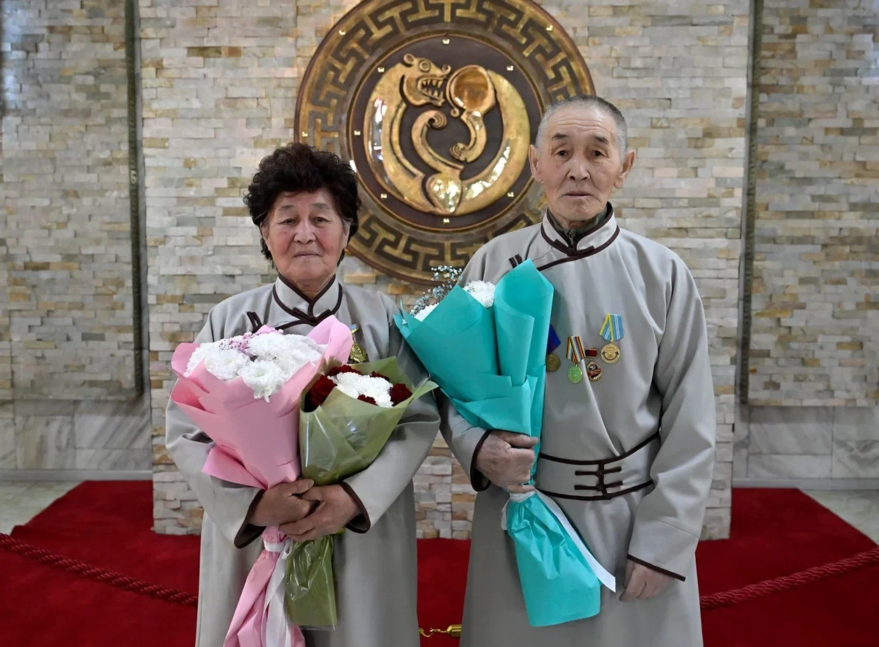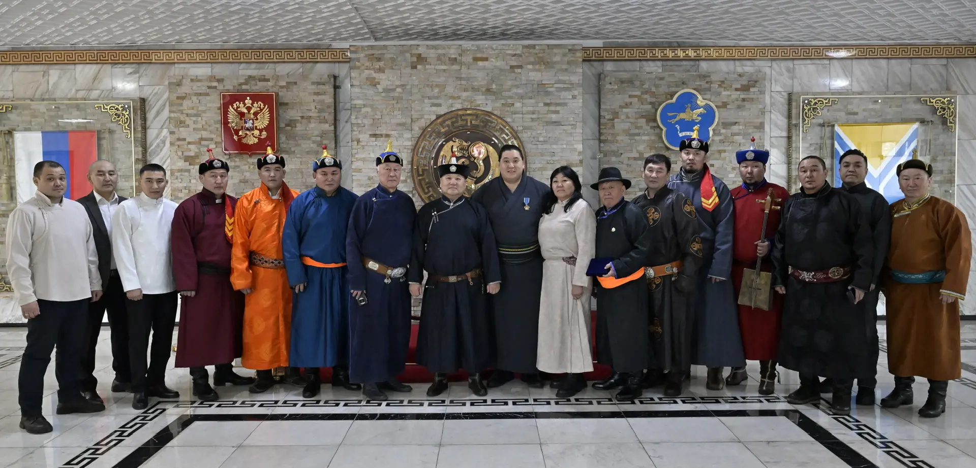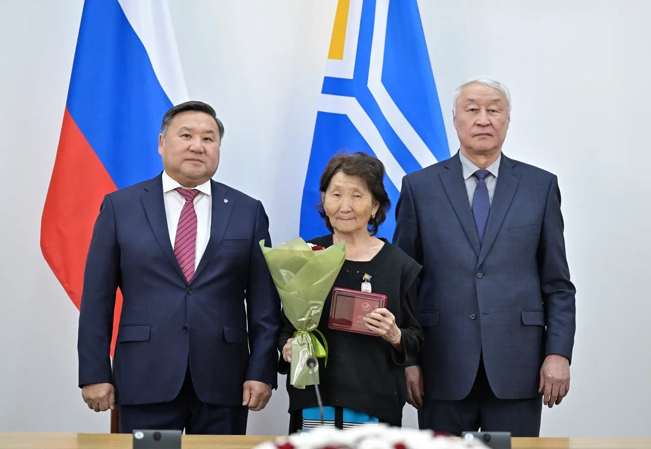 На торжественном собрании были вручены государственные награды родным военнослужащих из Тувы, героически погибших в ходе выполнения боевых задач в зоне СВО. Зрительный зал стоя аплодировал жёнам и матерям героев, которые выходили на сцену за наградами.