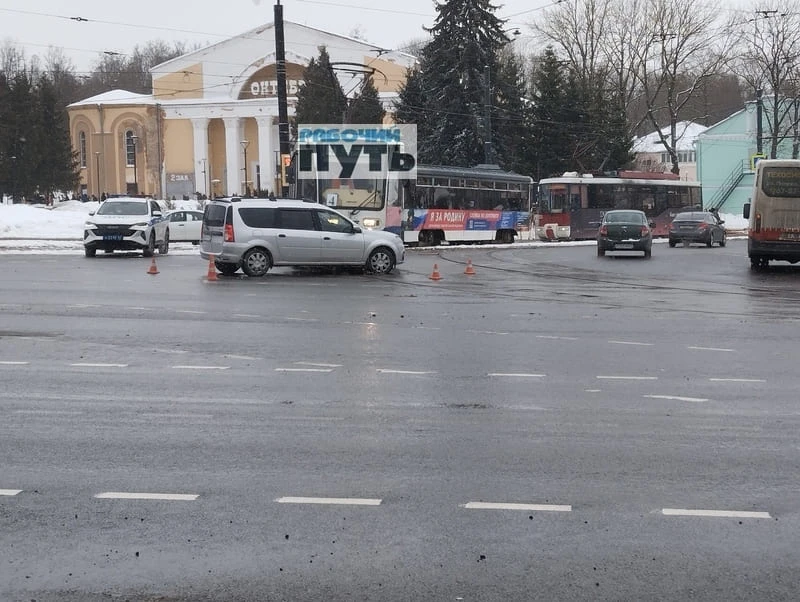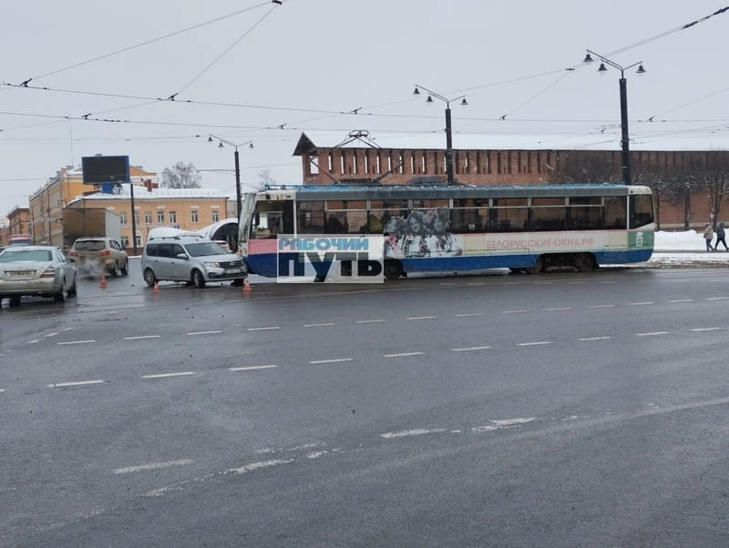 Авария с участием легкового авто и общественного транспорта произошла днем 20 февраля на площади Победы в Смоленске. ДТП собрало пробку из трамваев.