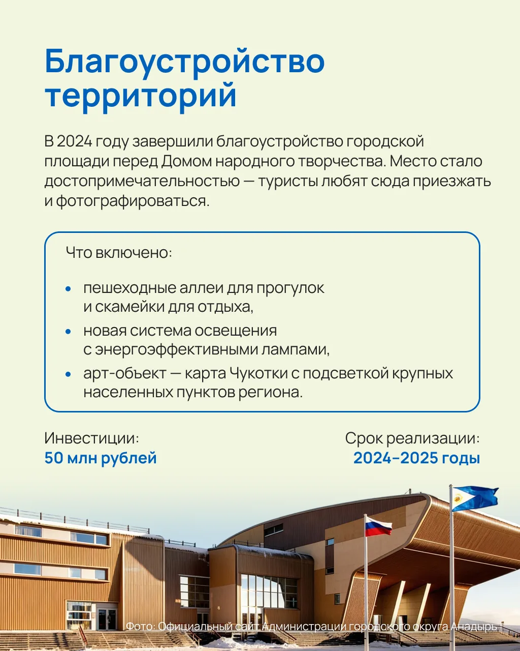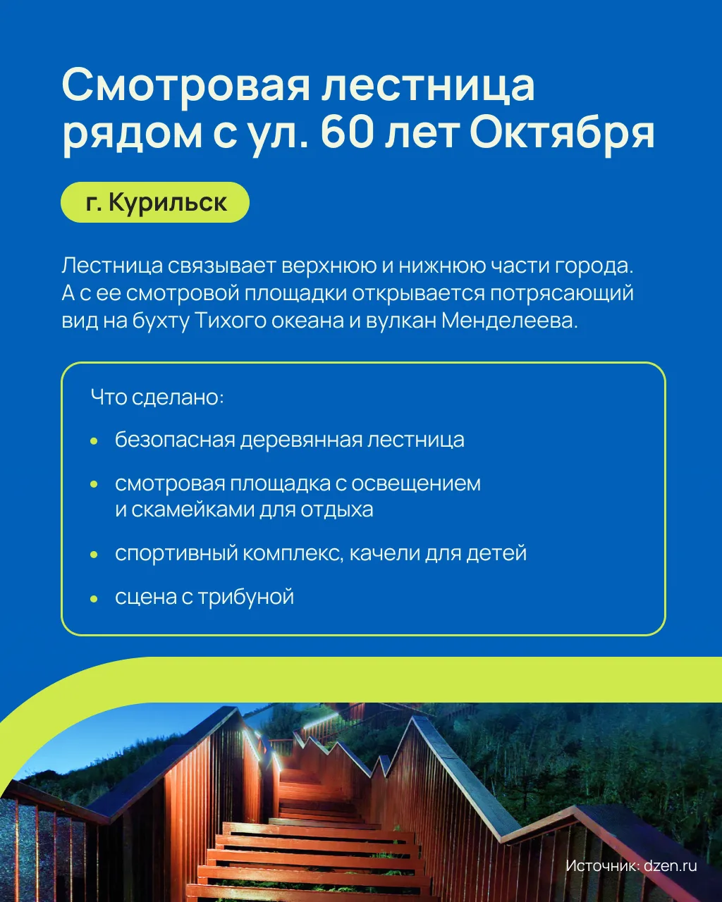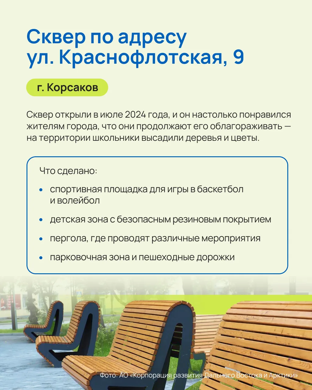 В маленьких городах на Сахалине и Курилах строят новые парки и скверы, чтобы жителям было где отдохнуть с семьей и друзьями. А еще ставят скамейки и беседки на смотровых площадках и ремонтируют пешеходные переходы.