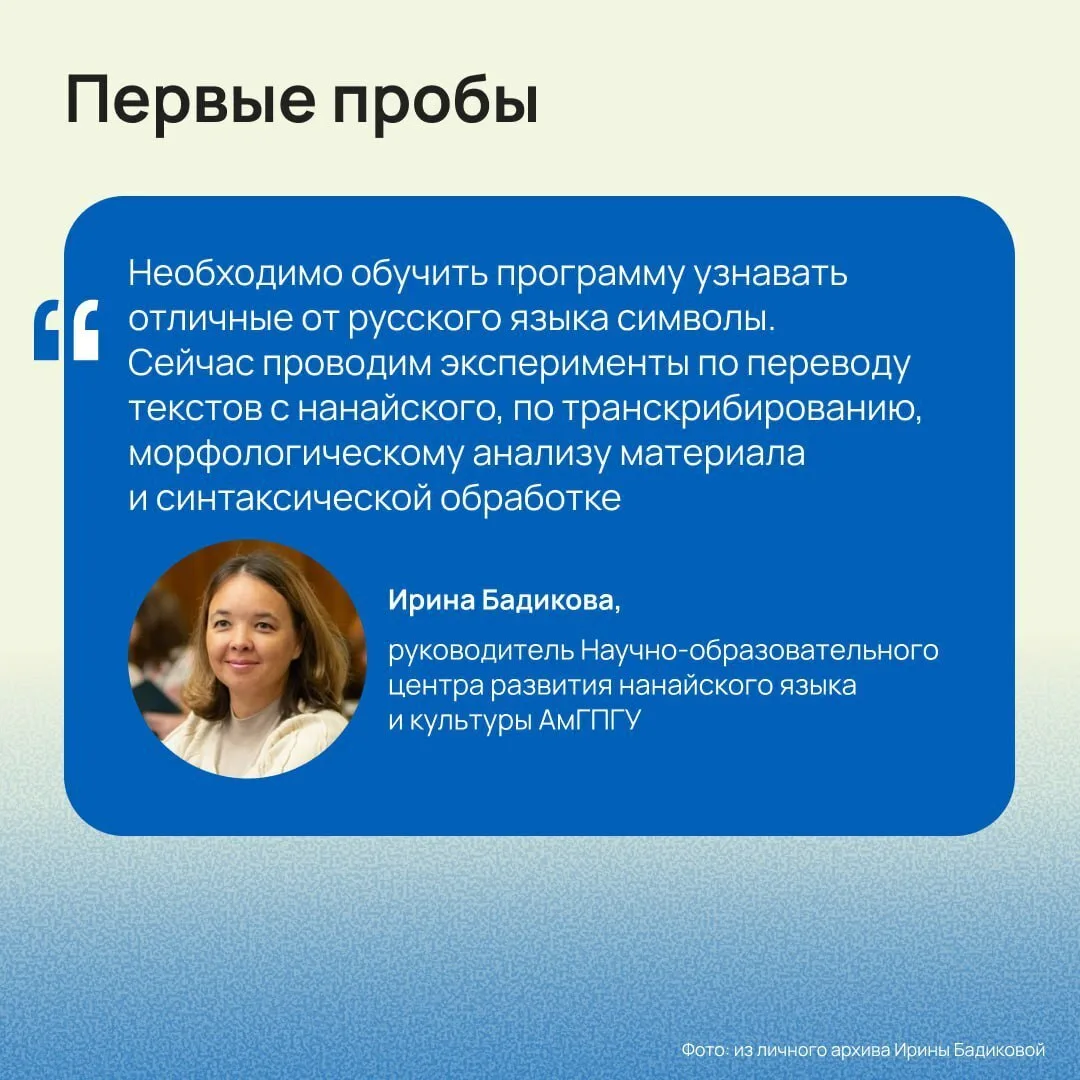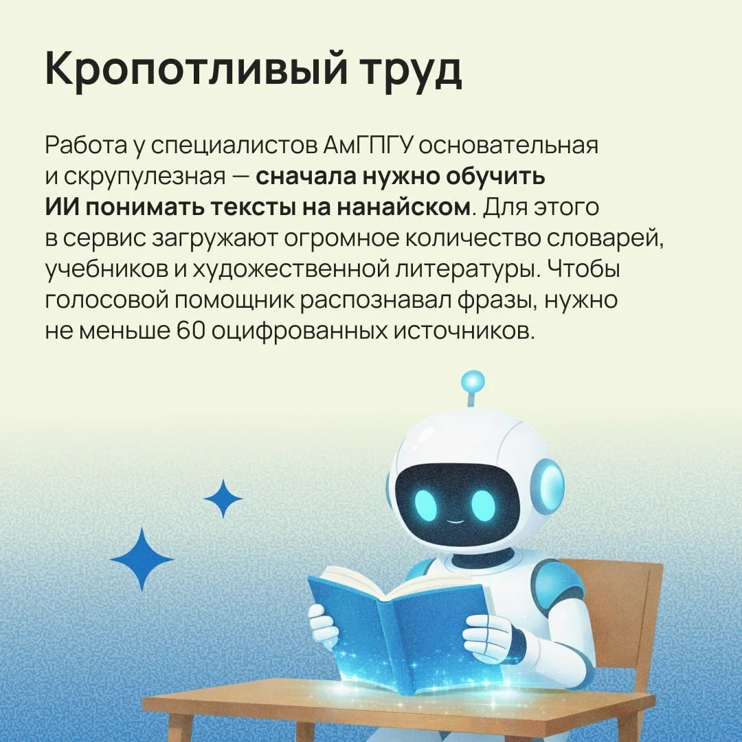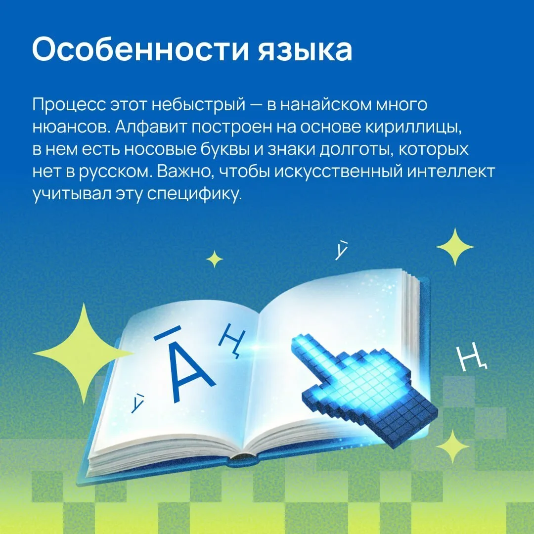 В регионе проживают чуть больше 10 тысяч нанайцев, а активно разговаривают на родном языке менее 300 человек. Речь этноса исчезает. Чтобы сберечь культуру коренного малочисленного народа Дальнего Востока, в Амурском гуманитарно-педагогическом госуниверситете придумали ИИ-ассистента.