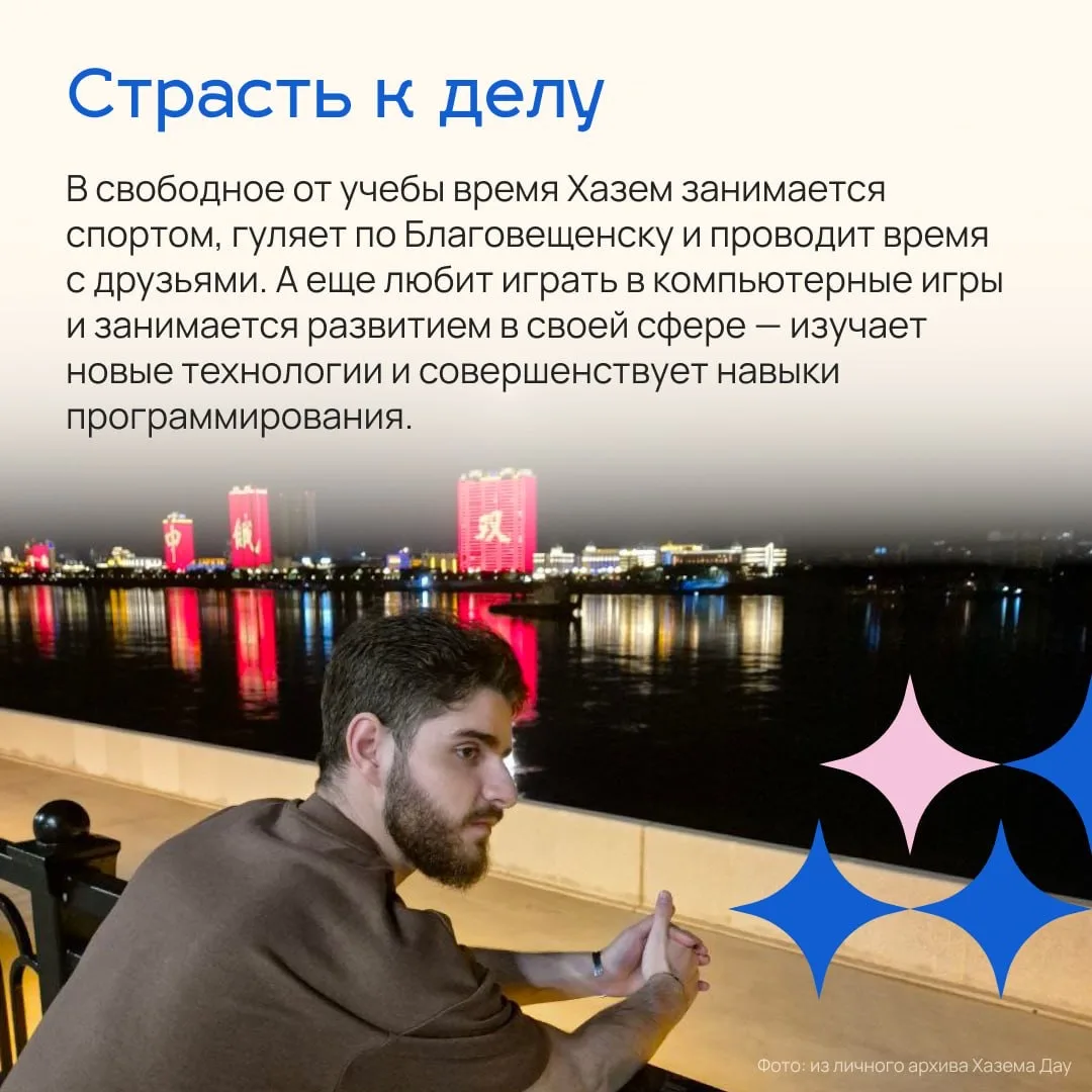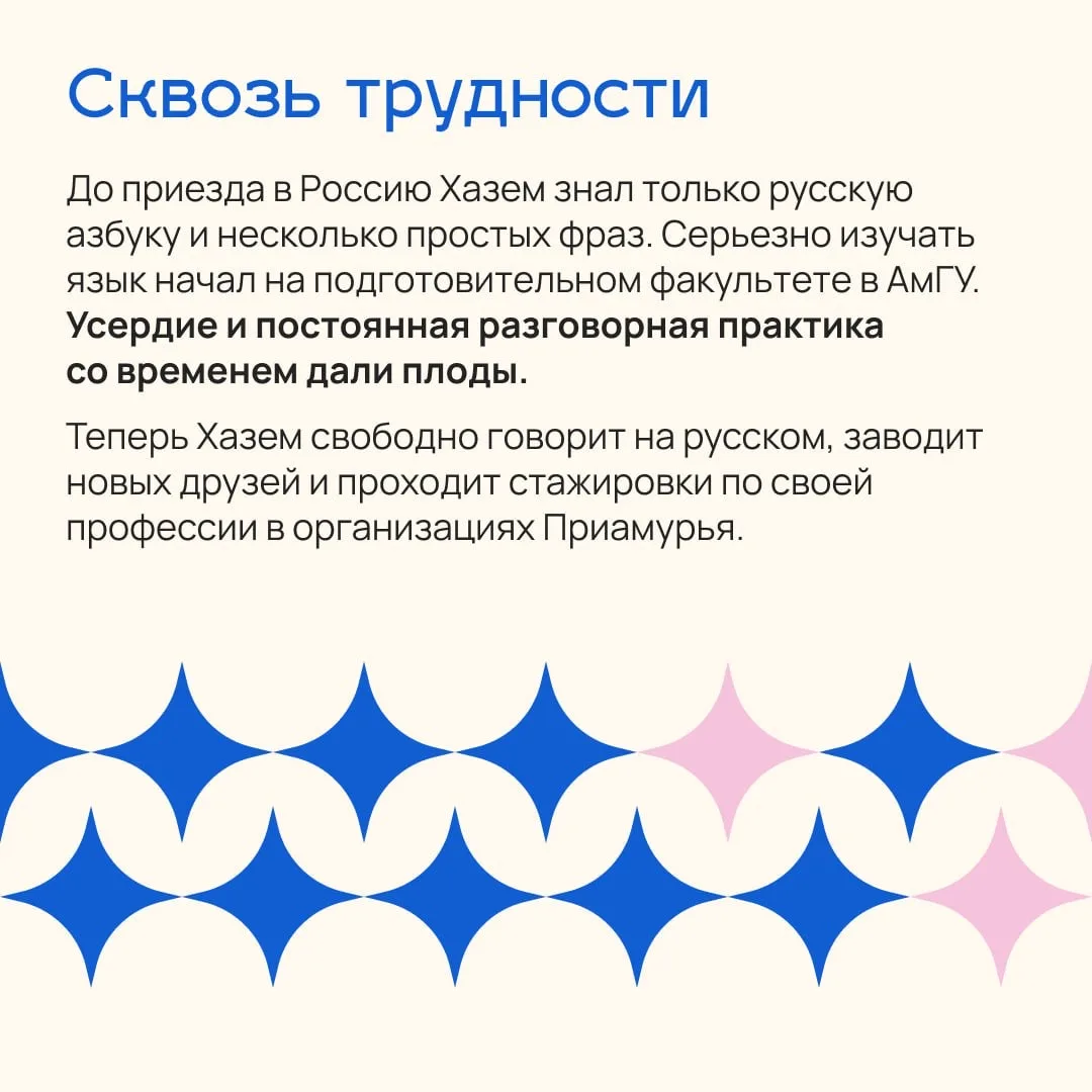 Как студента из Сирии встретила Амурская область, какие трудности преодолел парень и к чему сейчас стремится начинающий IT-специалист, — рассказываем в карточках. А большой материал с Хаземом читайте на нашем сайте.