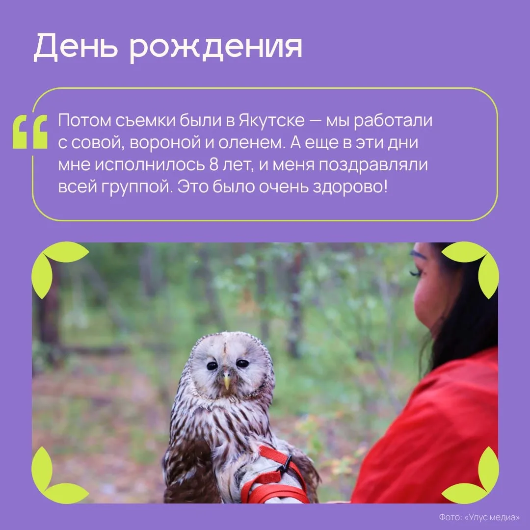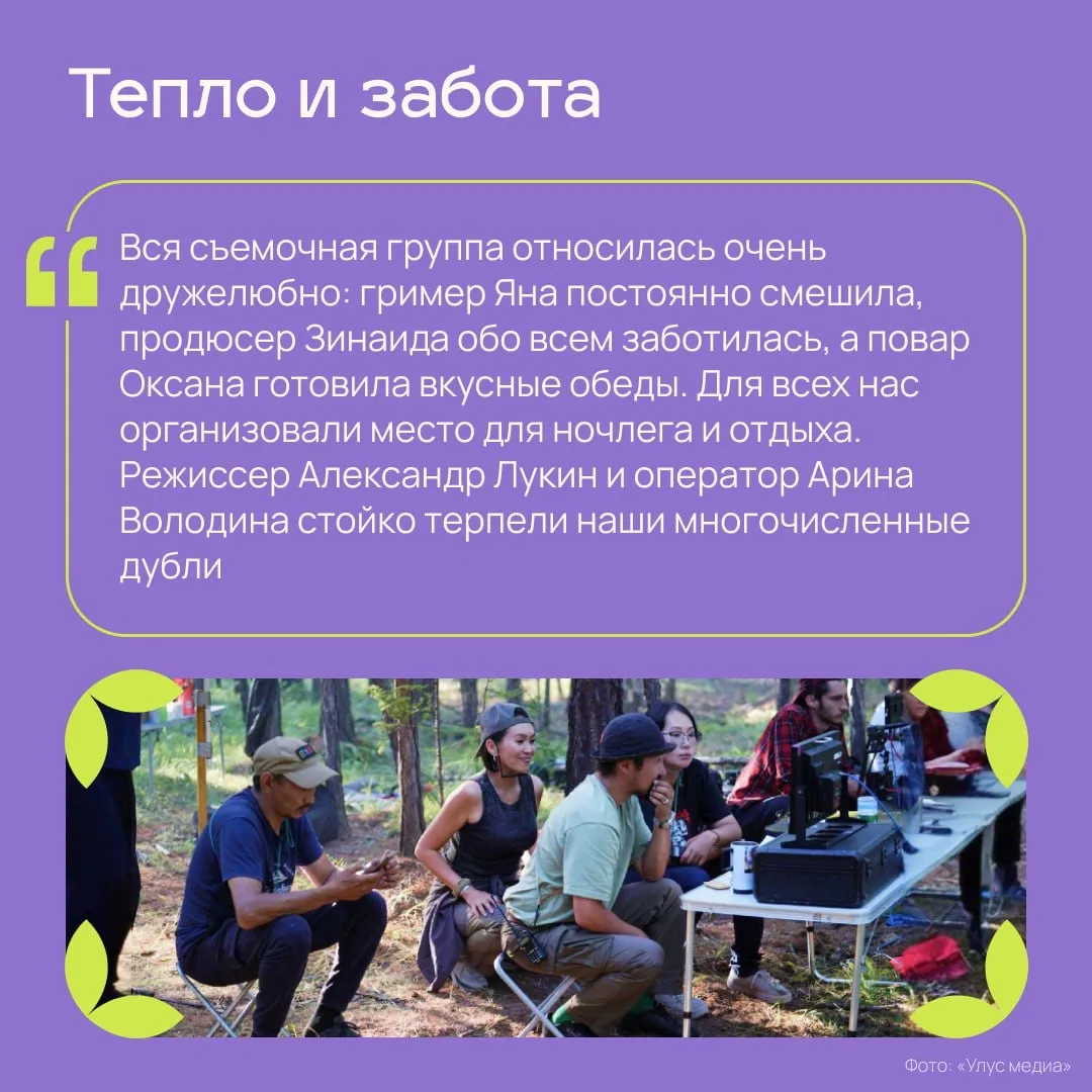 Съемки уже завершили, но работа над картиной идет полным ходом: монтаж, озвучка, компьютерная графика. Наша редакция пообщались с исполнителем главной роли — учеником 4 класса из небольшого села Күрэҥ-Ат Намского улуса Дамиром Дьяконовым. Мальчик впервые снимался в кино и покорил съемочную группу своей естественной игрой и искренностью.