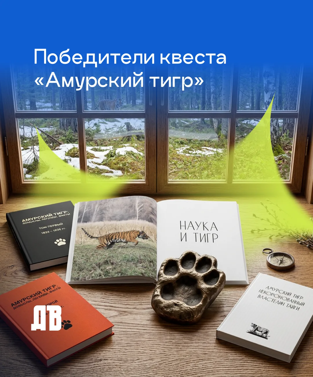 • за 1 место — отпечаток лапы амурского тигра в реальном размере, отлитым в бронзе, а также набор книг «Амурский тигр: некоронованный властелин тайги» и «Амурский тигр: домыслы, легенды, факты» в 2-х частях