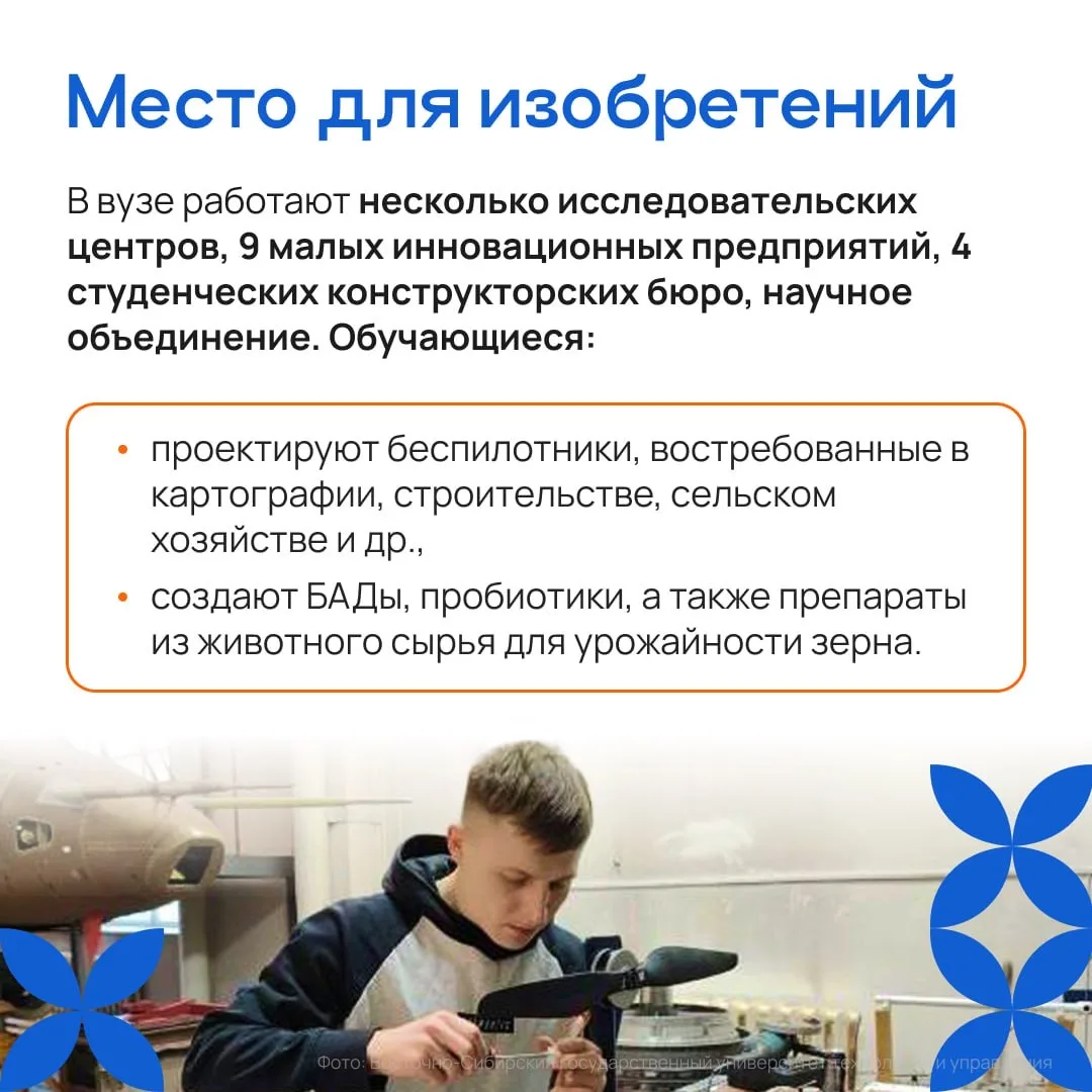 🔹 в университете работает бизнес-инкубатор, где талантливые студенты и преподаватели могут получить поддержку своего стартапа,