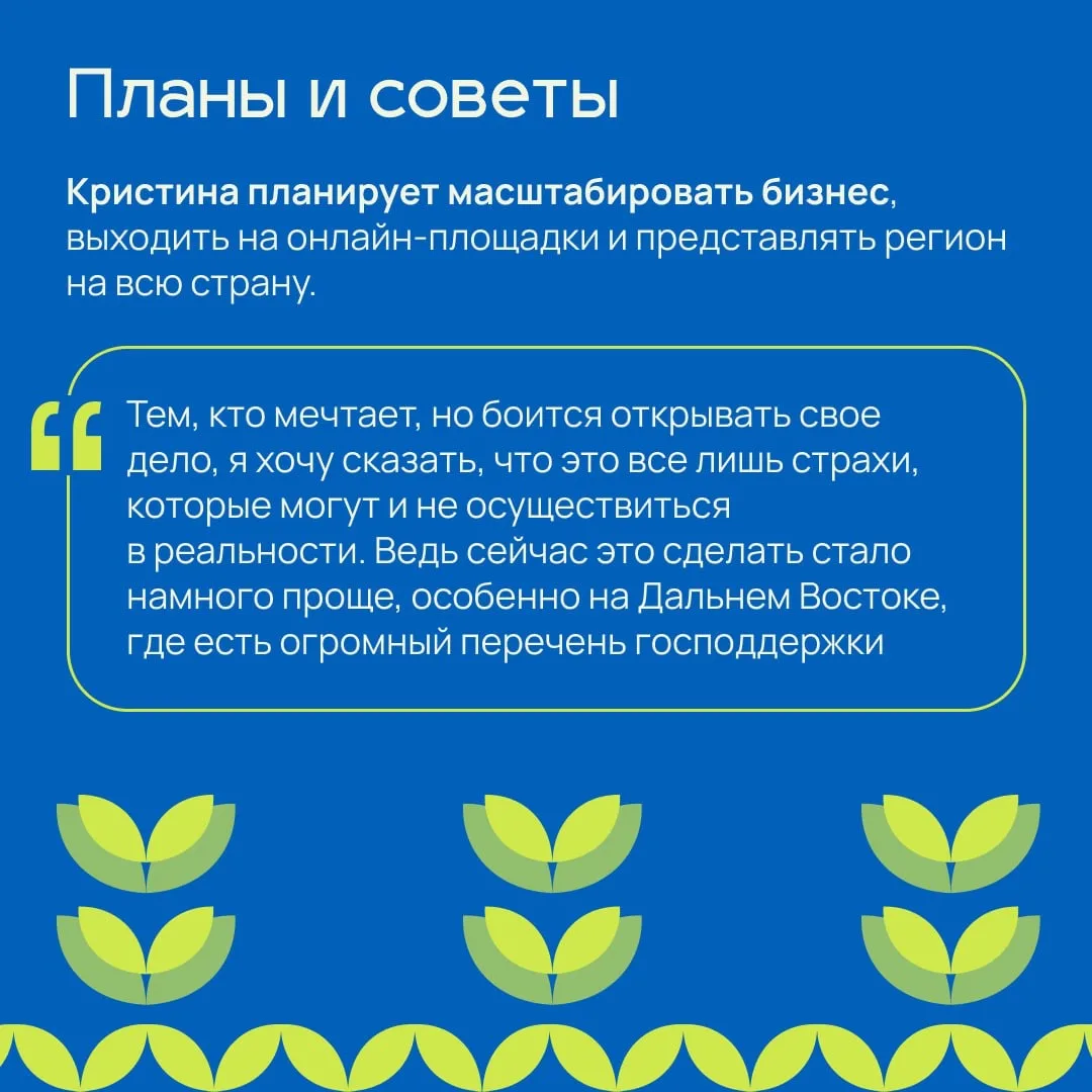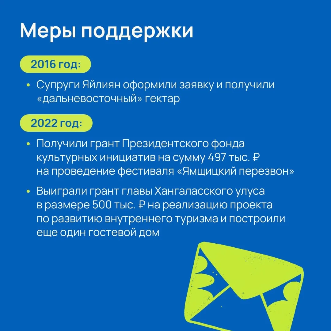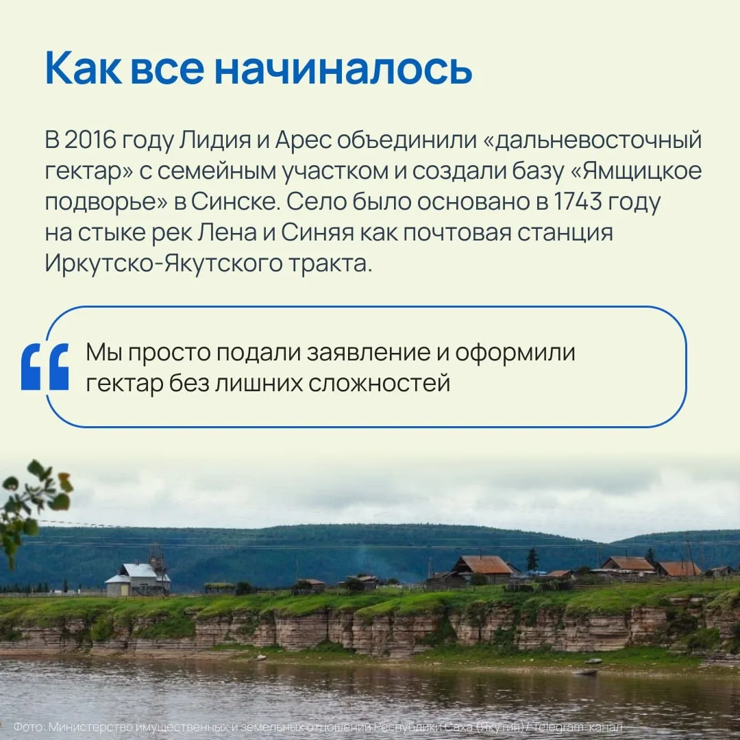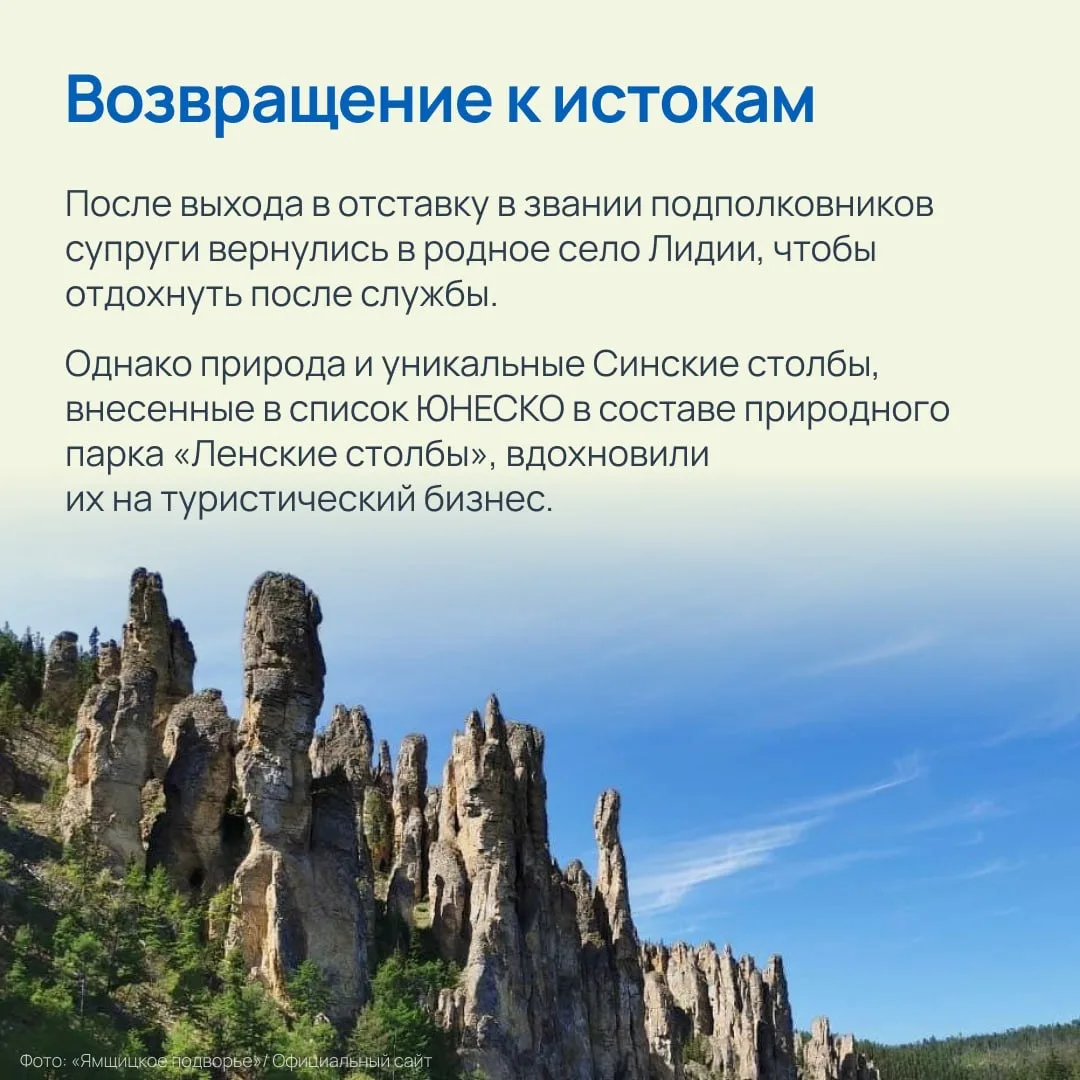 Ее история доказывает, что опора на традиции становится основой успешного бизнеса. Лидия с мужем Айресом — ветераны МВД, нашли свое призвание на малой родине. В Синске на «дальневосточном гектаре» им удалось создать туристический комплекс и музей ямщицкого быта, в которых прошлое гармонично переплетается с настоящим.