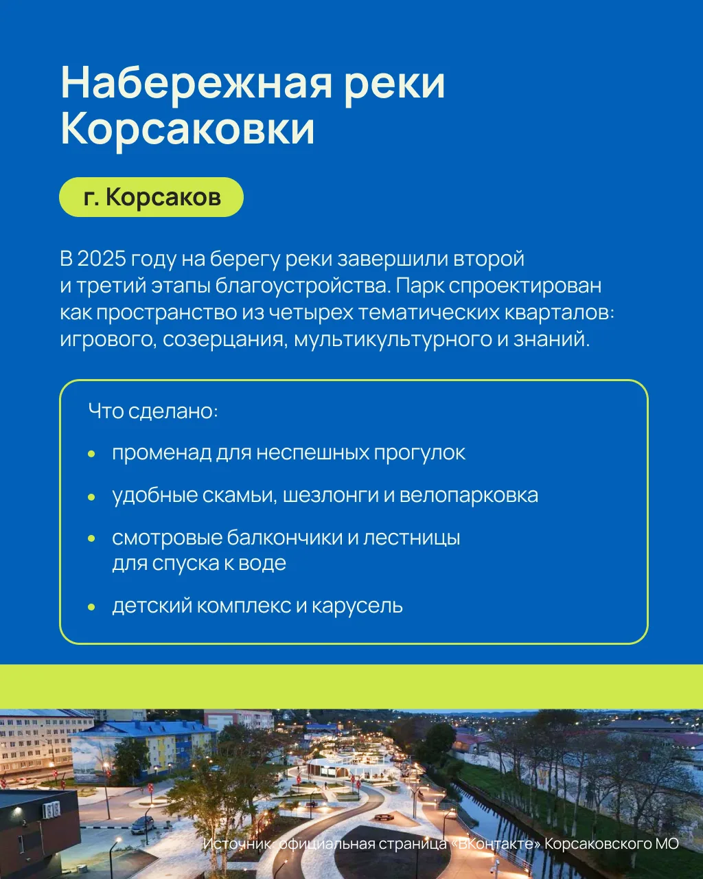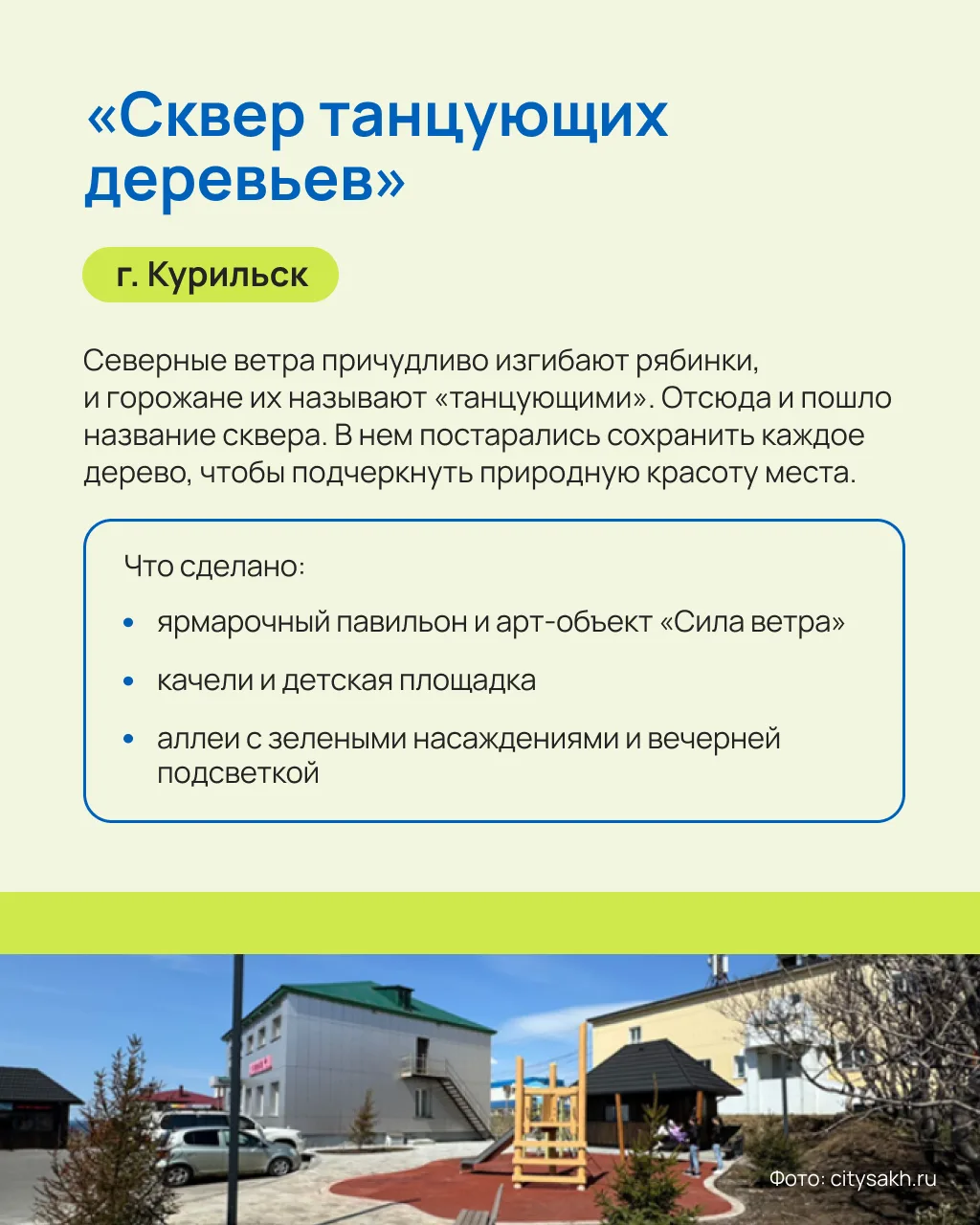 Сахалинская область ежегодно выигрывает в конкурсе. В карточках показываем, как победители 2023-2025 годов изменили регион. Уже сейчас вы можете пройтись по новым скверам, посмотреть спектакль в амфитеатре или заняться спортом на волейбольной площадке.
