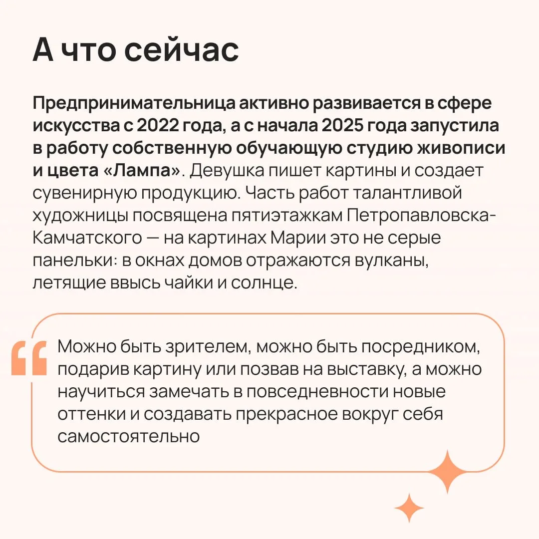 О том, как Мария искала свой путь и чем живет сейчас, рассказали в карточках — читайте, вдохновляйтесь и ставьте ❤️!
