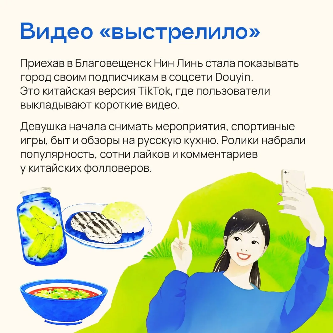 📱 «Хочу, чтобы в Китае больше людей узнали, что через реку есть хорошие иностранные друзья, вкусная еда и интересные традиции», — китайский блогер Нин Линь сделала популярным среди своей аудитории город Благовещенск.