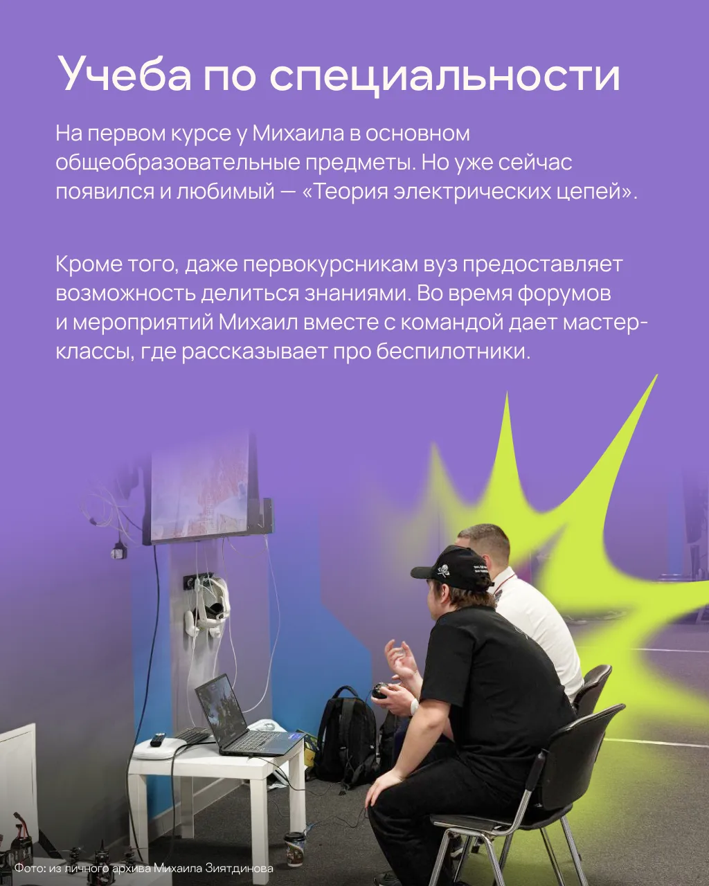 Еще до поступления, в родном Белогорске Амурской области, Михаил занимался дрон-рейсингом — гонками на дронах. Во Владивосток он решил переехать, чтобы и дальше реализовываться в этой сфере, но уже в роли инженера — заниматься проектированием, обслуживанием и модернизацией летательных аппаратов, в том числе и беспилотников.