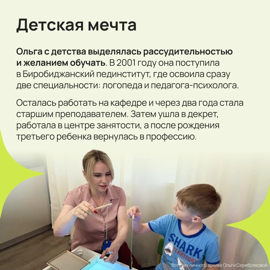 Знакомьтесь: героиня нашего сегодняшнего поста — Ольга Серебрякова из Биробиджана, мама троих детей и логопед по призванию.